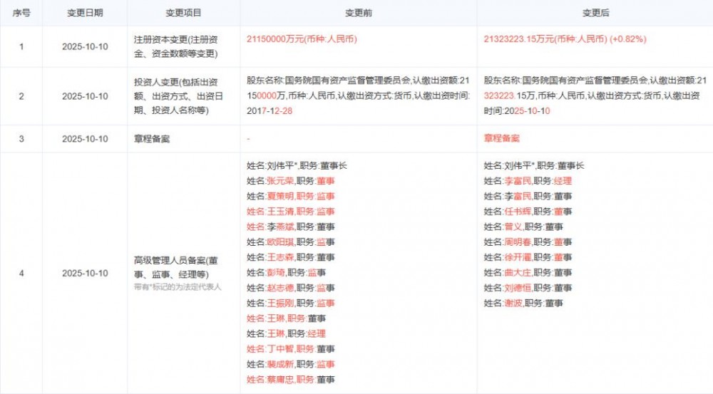 10月10日,中國(guó)長(zhǎng)江三峽集團(tuán)有限公司注冊(cè)資本發(fā)生變更,國(guó)務(wù)院國(guó)資委對(duì)其進(jìn)行增資,根據(jù)增資情況顯示:三峽集團(tuán)注冊(cè)資本由21150000萬(wàn)元增資至21323223.15萬(wàn)元。同時(shí),部分高管發(fā)生變更。