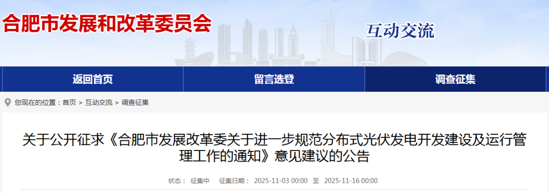 11月3日,安徽省合肥市發(fā)展和改革委員會(huì)發(fā)布關(guān)于公開征求《合肥市發(fā)展改革委關(guān)于進(jìn)一步規(guī)范分布式光伏發(fā)電開發(fā)建設(shè)及運(yùn)行管理工作的通知》意見建議的公告。