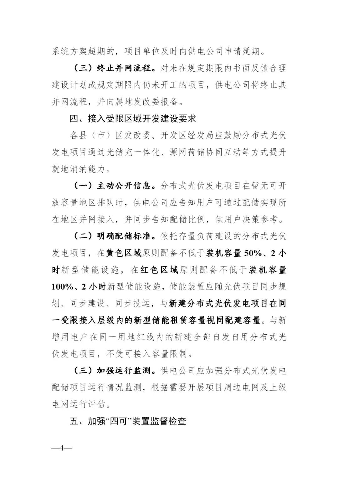 文件明確,依托存量負(fù)荷建設(shè)的分布式光伏發(fā)電項(xiàng)目,在黃色區(qū)域原則配備不低于裝機(jī)容量50%、2小時(shí)新型儲(chǔ)能設(shè)施,在紅色區(qū)域原則配備不低于裝機(jī)容量100%、2小時(shí)新型儲(chǔ)能設(shè)施,儲(chǔ)能裝置應(yīng)隨光伏項(xiàng)目同步規(guī)劃、同步建設(shè)、同步投運(yùn),與新建分布式光伏發(fā)電項(xiàng)目在同一受限接入層級(jí)內(nèi)的新型儲(chǔ)能租賃容量視同配建容量。與新增用電戶在同一用地紅線內(nèi)的新建全部自發(fā)自用分布式光伏發(fā)電項(xiàng)目,不受可接入容量限制。