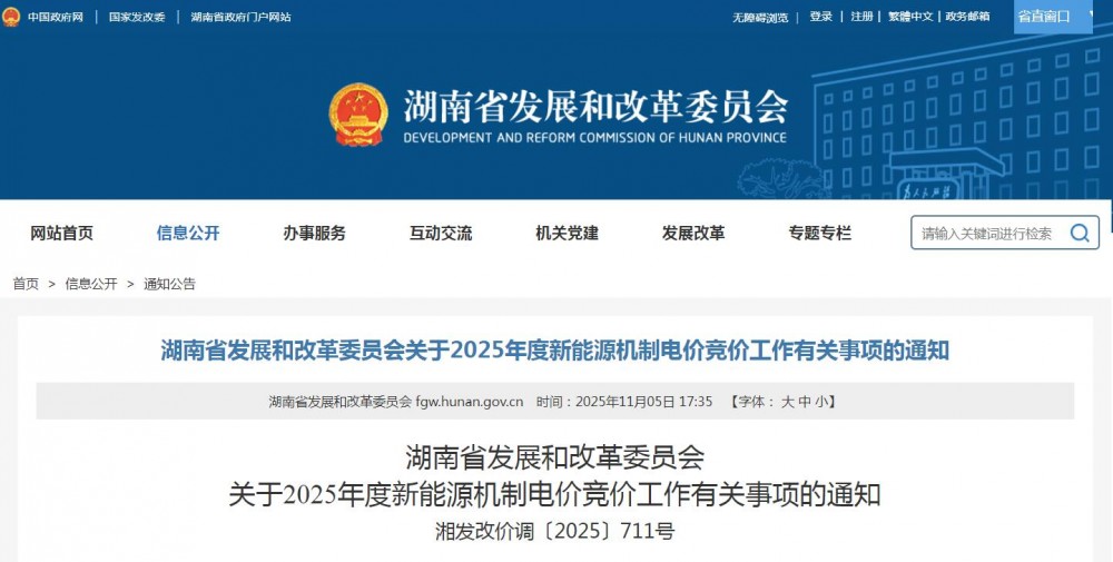 11月5日,湖南省發(fā)改委發(fā)布關于2025年度新能源機制電價競價工作有關事項的通知。