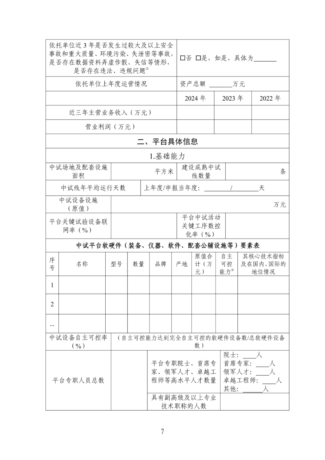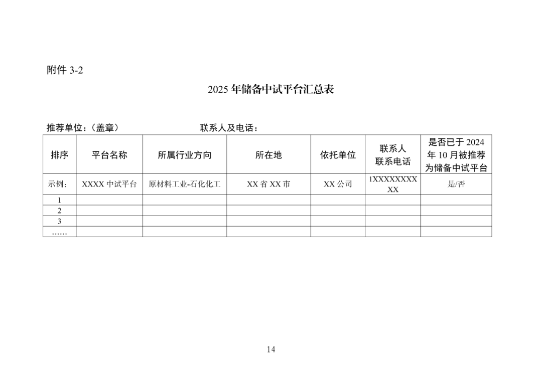 (一)各地工業(yè)和信息化主管部門于11月28日前依據(jù)《儲(chǔ)備中試平臺(tái)基本條件和管理要求》(附件3),動(dòng)員符合條件的中試平臺(tái)依托單位登錄制造業(yè)中試數(shù)字化管理服務(wù)平臺(tái)(http://zhongshi.ceprei.com)填報(bào)上傳《儲(chǔ)備中試平臺(tái)申報(bào)信息表》蓋章掃描件,并按照有關(guān)程序和要求遴選出儲(chǔ)備中試平臺(tái),于12月15日前在制造業(yè)中試數(shù)字化管理服務(wù)平臺(tái)上傳《2025年儲(chǔ)備中試平臺(tái)匯總表》蓋章掃描件。已納入2024年度儲(chǔ)備庫的中試平臺(tái)(首批工業(yè)和信息化部重點(diǎn)培育中試平臺(tái)除外)須參照上述要求填報(bào)更新相關(guān)信息,由各地省級(jí)工業(yè)和信息化主管部門復(fù)核。
