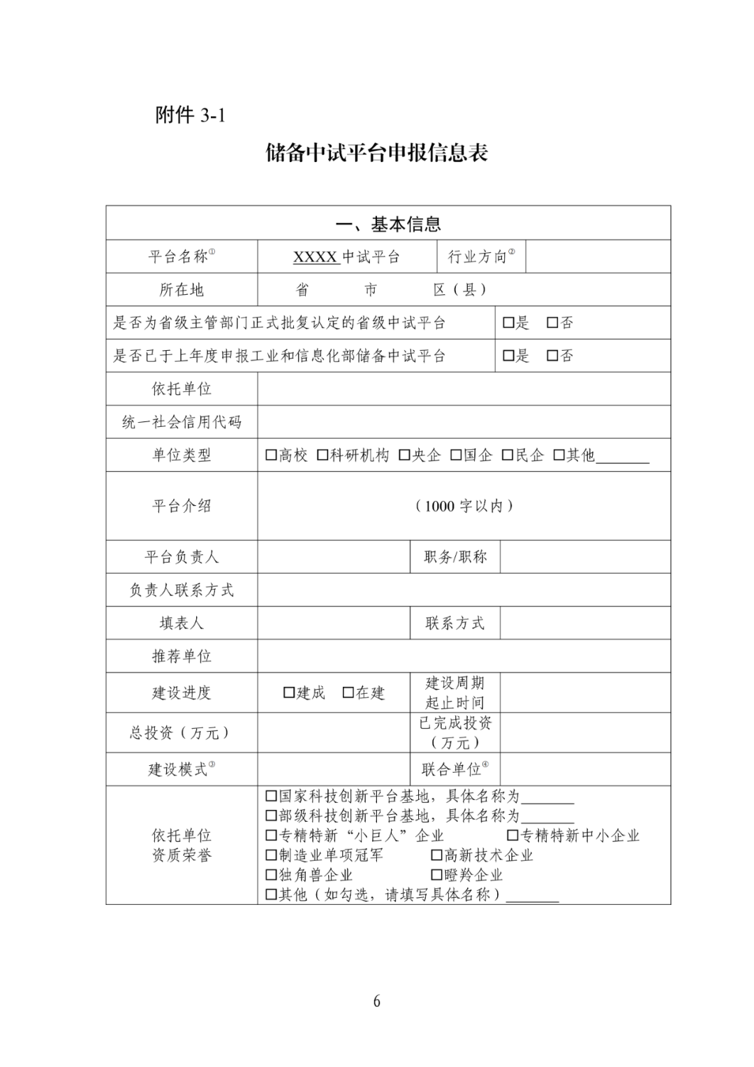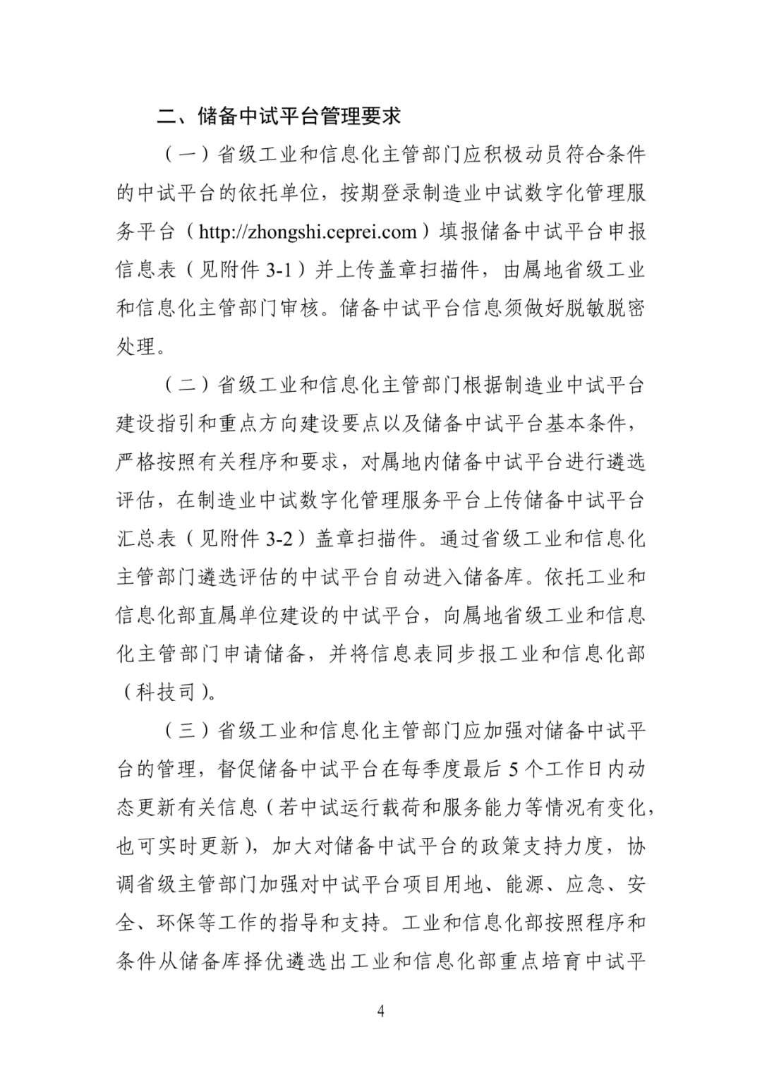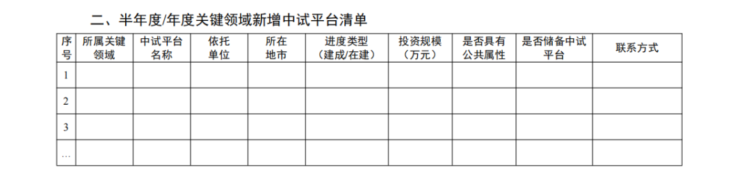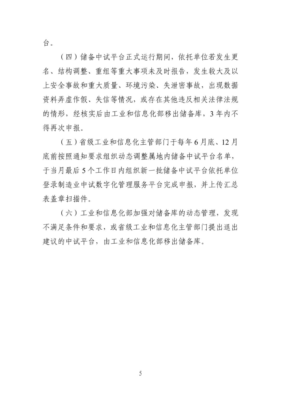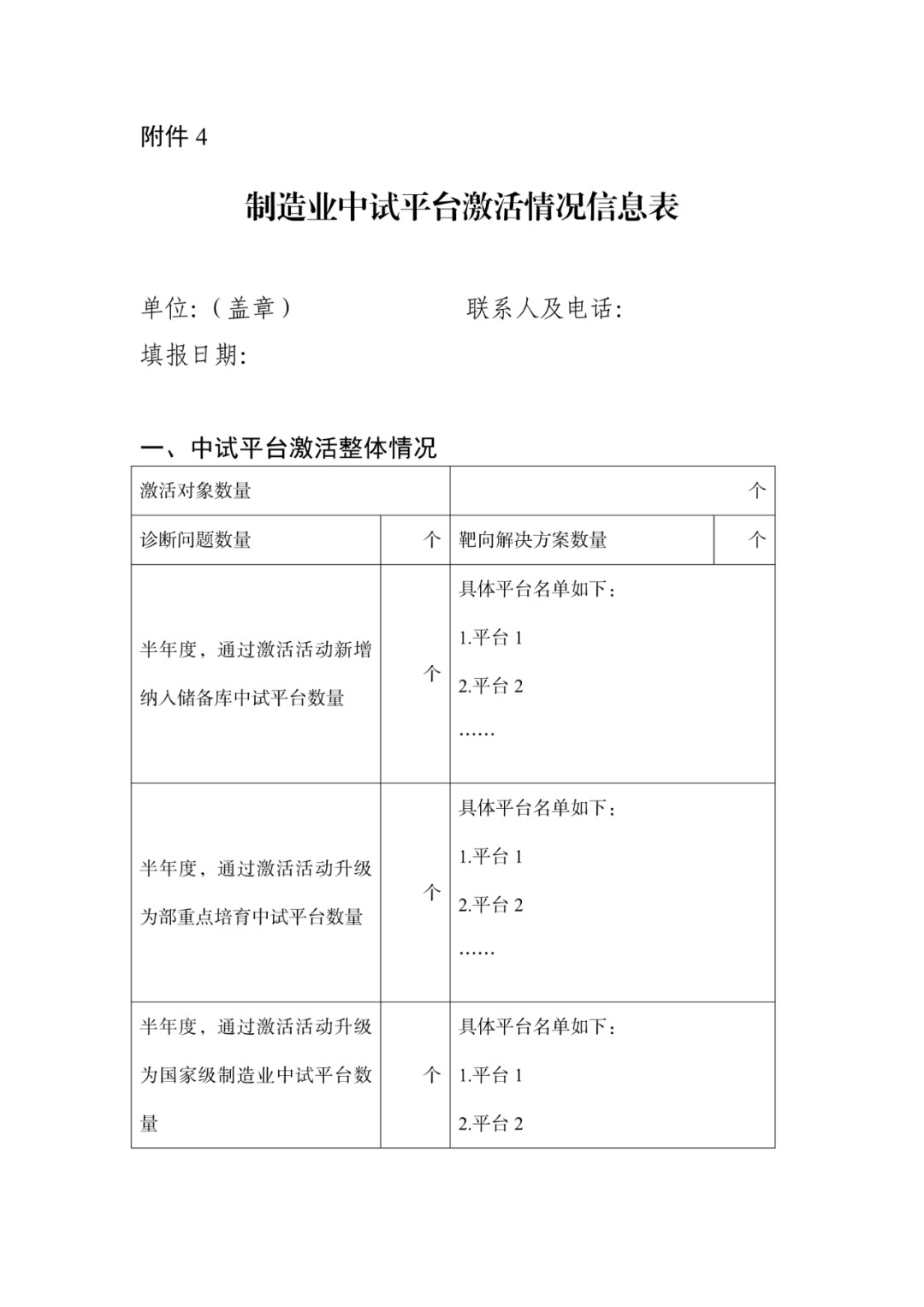 (二)各地工業(yè)和信息化主管部門于每年6月、12月最后5個(gè)工作日內(nèi)將屬地內(nèi)儲(chǔ)備中試平臺(tái)名單動(dòng)態(tài)調(diào)整情況、制造業(yè)中試平臺(tái)激活情況信息表(附件4)和補(bǔ)齊情況信息表(附件5),在制造業(yè)中試數(shù)字化管理服務(wù)平臺(tái)填報(bào)并上傳蓋章掃描件。