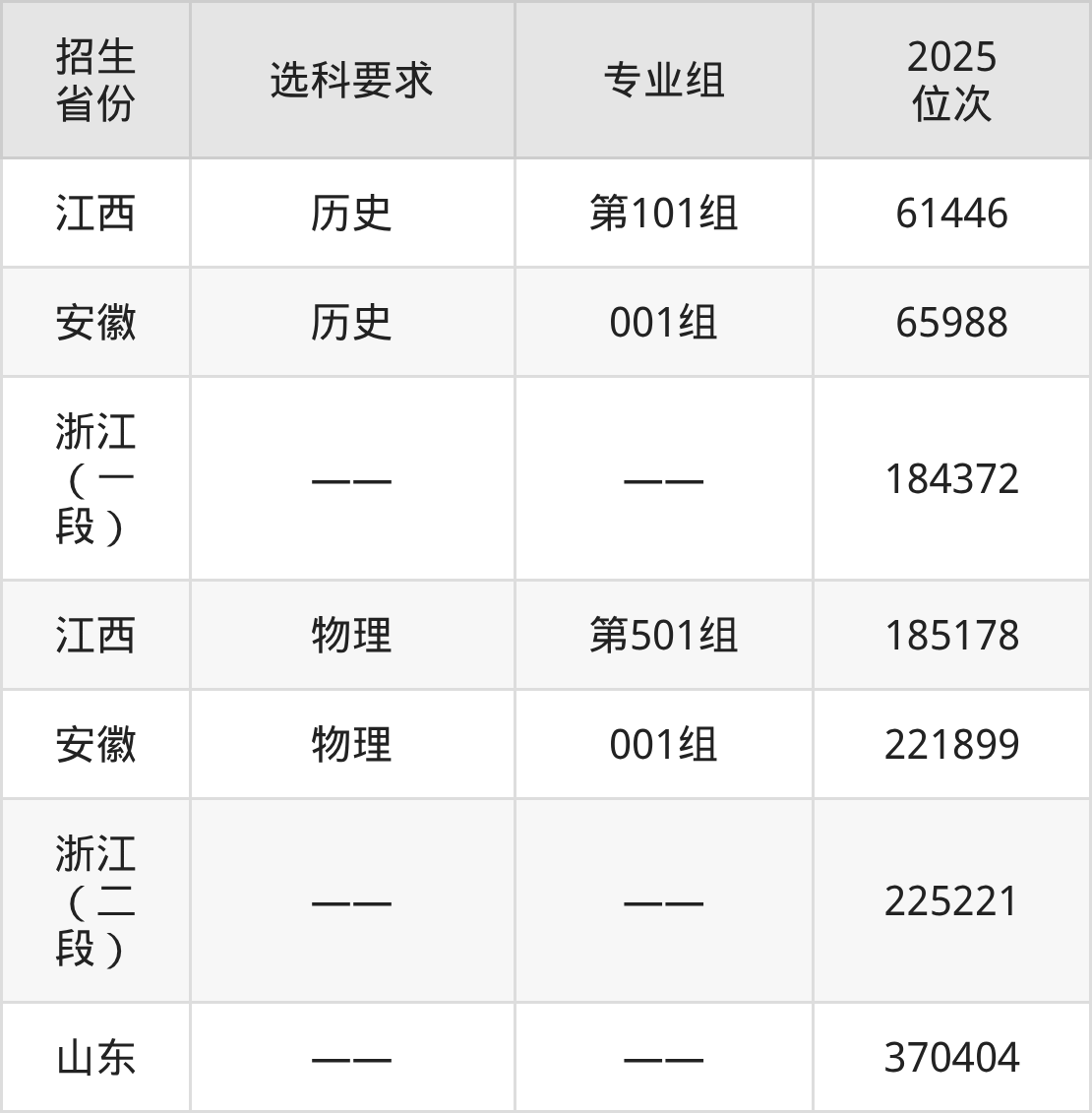 上海南湖職業(yè)技術(shù)學(xué)院2025年在全國(guó)各省的位次差異較大,最高位次是61446位(江西歷史類)、最低位次是370404位(山東)。各省具體位次請(qǐng)看下圖: