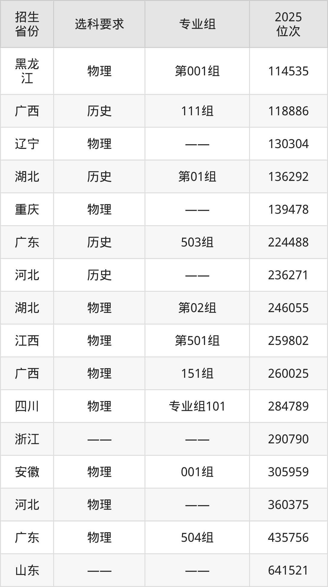 海南工商職業(yè)學(xué)院2025年在全國各省的位次差異較大,最高位次是114535位(黑龍江物理類)、最低位次是641521位(山東)。各省具體位次請看下圖: