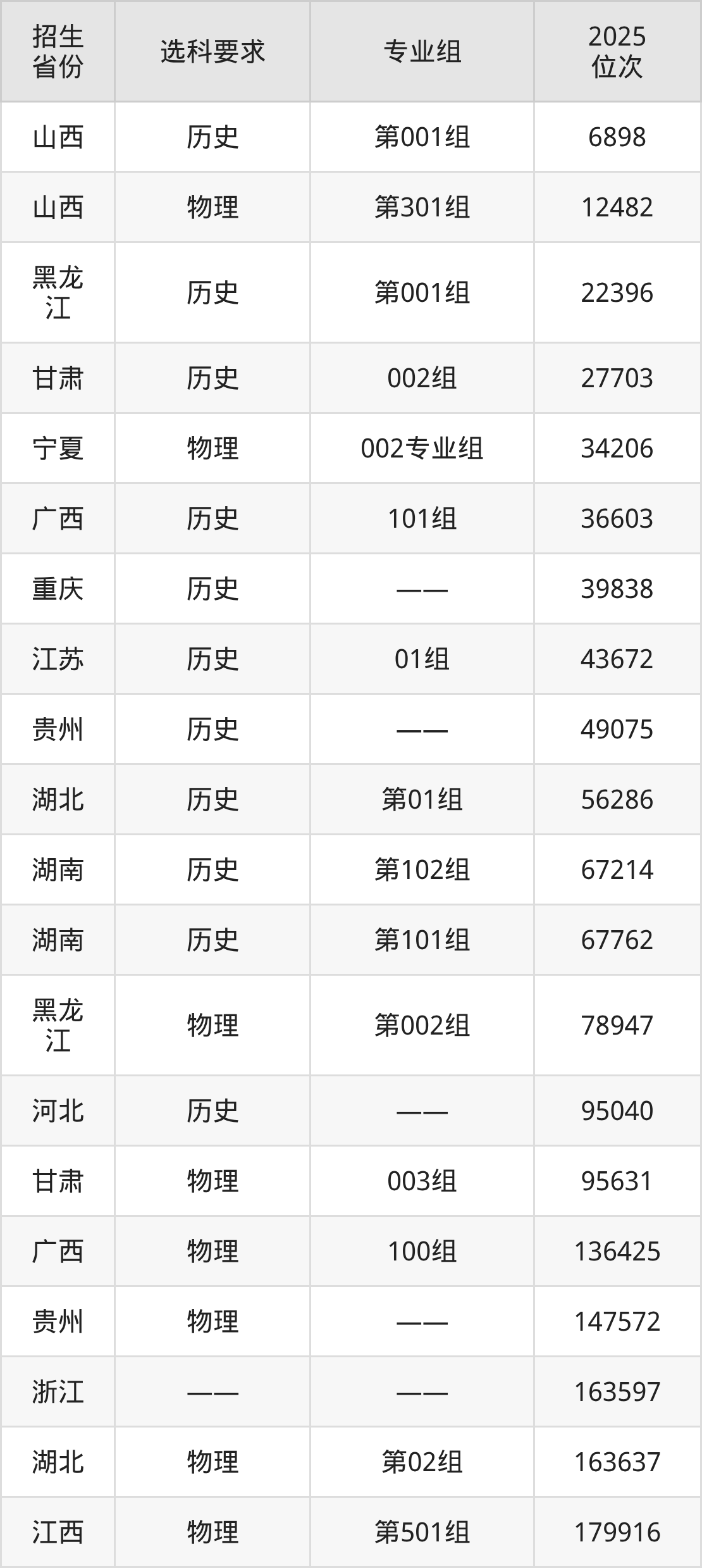 長沙職業(yè)技術(shù)學(xué)院2025年在全國各省的位次差異較大,最高位次是6898位(山西歷史類)、最低位次是313380位(廣東物理類)。各省具體位次請看下圖: