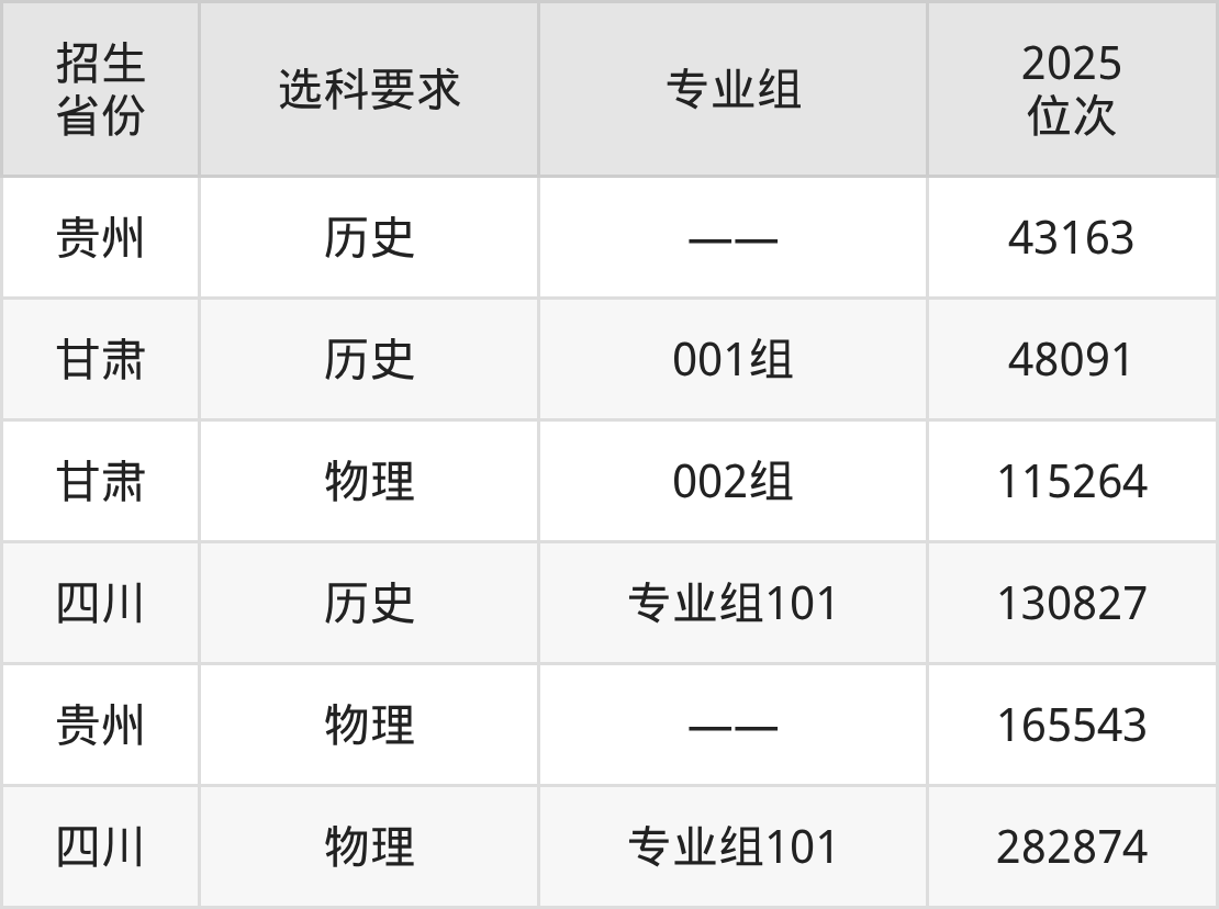 阿壩職業(yè)學(xué)院2025年在全國(guó)各省的位次差異較大,最高位次是43163位(貴州歷史類)、最低位次是282874位(四川物理類)。各省具體位次請(qǐng)看下圖: