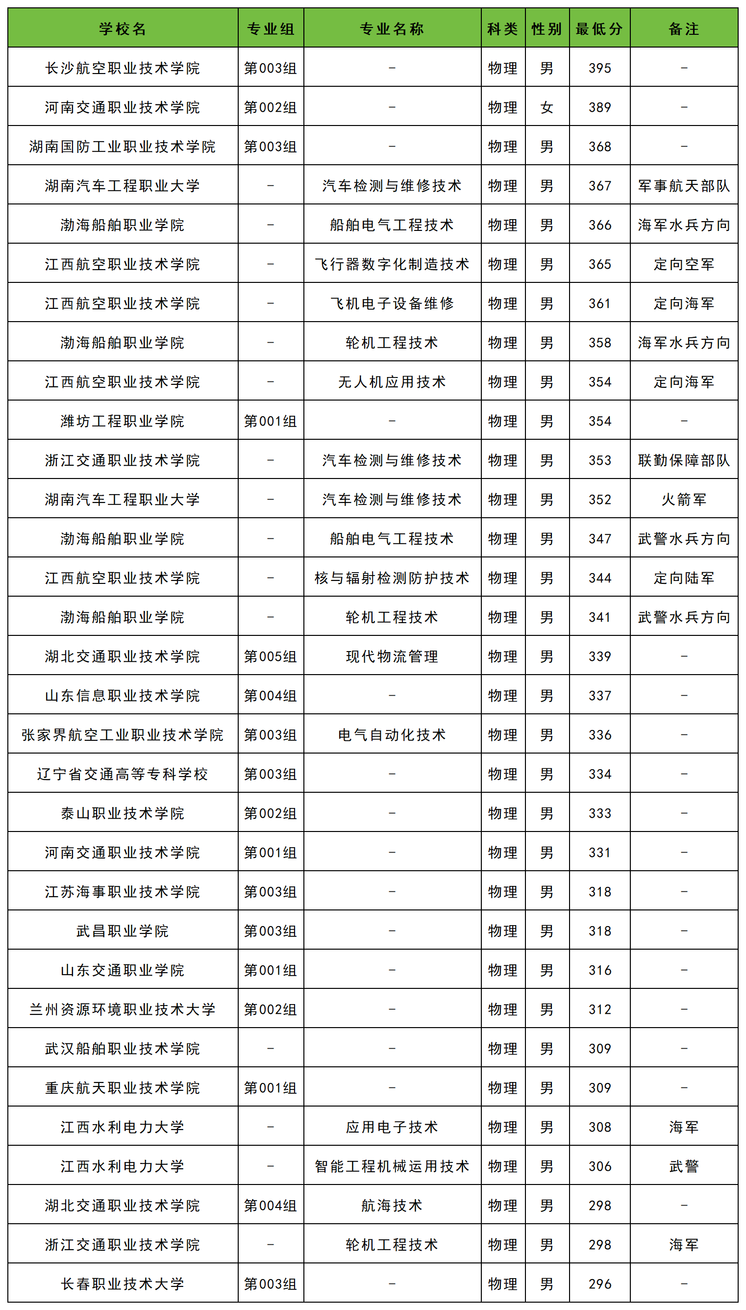 2025年黑龍江定向士官學(xué)校錄取分?jǐn)?shù)線物理類最低在296分以上,收分最低的學(xué)校為長春職業(yè)技術(shù)大學(xué)(第003組,男)。最高分可達(dá)到395分以上,對應(yīng)學(xué)校為長沙航空職業(yè)技術(shù)學(xué)院(第003組,男)。