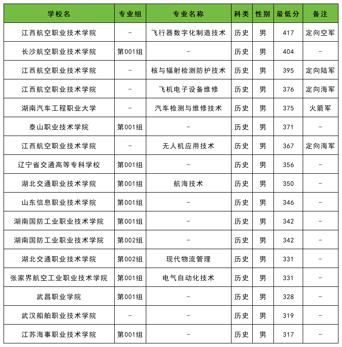 2025年黑龍江定向士官學(xué)校錄取分?jǐn)?shù)線歷史類最低在317分以上,收分最低的學(xué)校為江蘇海事職業(yè)技術(shù)學(xué)院(第001組,男)。最高分可達(dá)到417分,對應(yīng)學(xué)校為江西航空職業(yè)技術(shù)學(xué)院(飛行器數(shù)字化制造技術(shù),男,定向空軍)。
