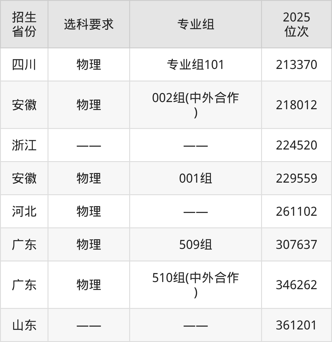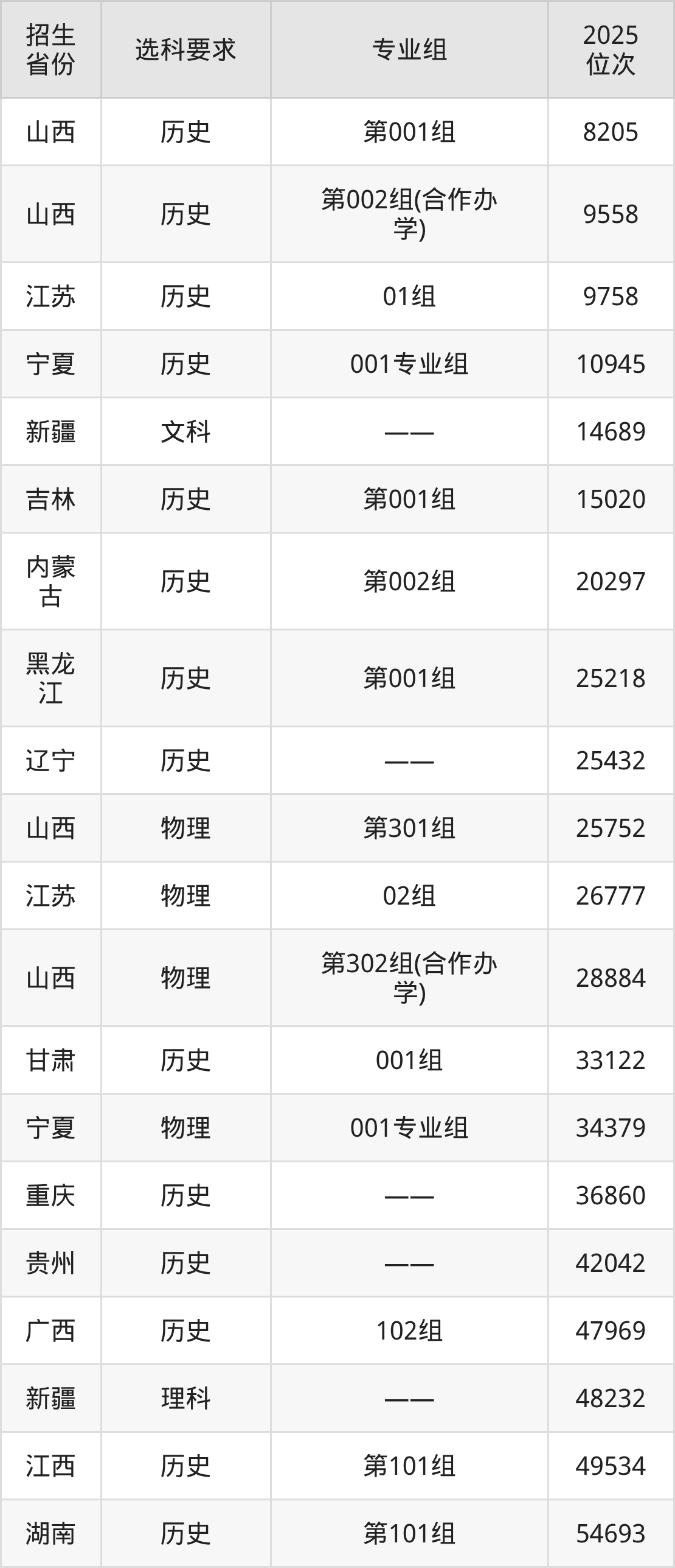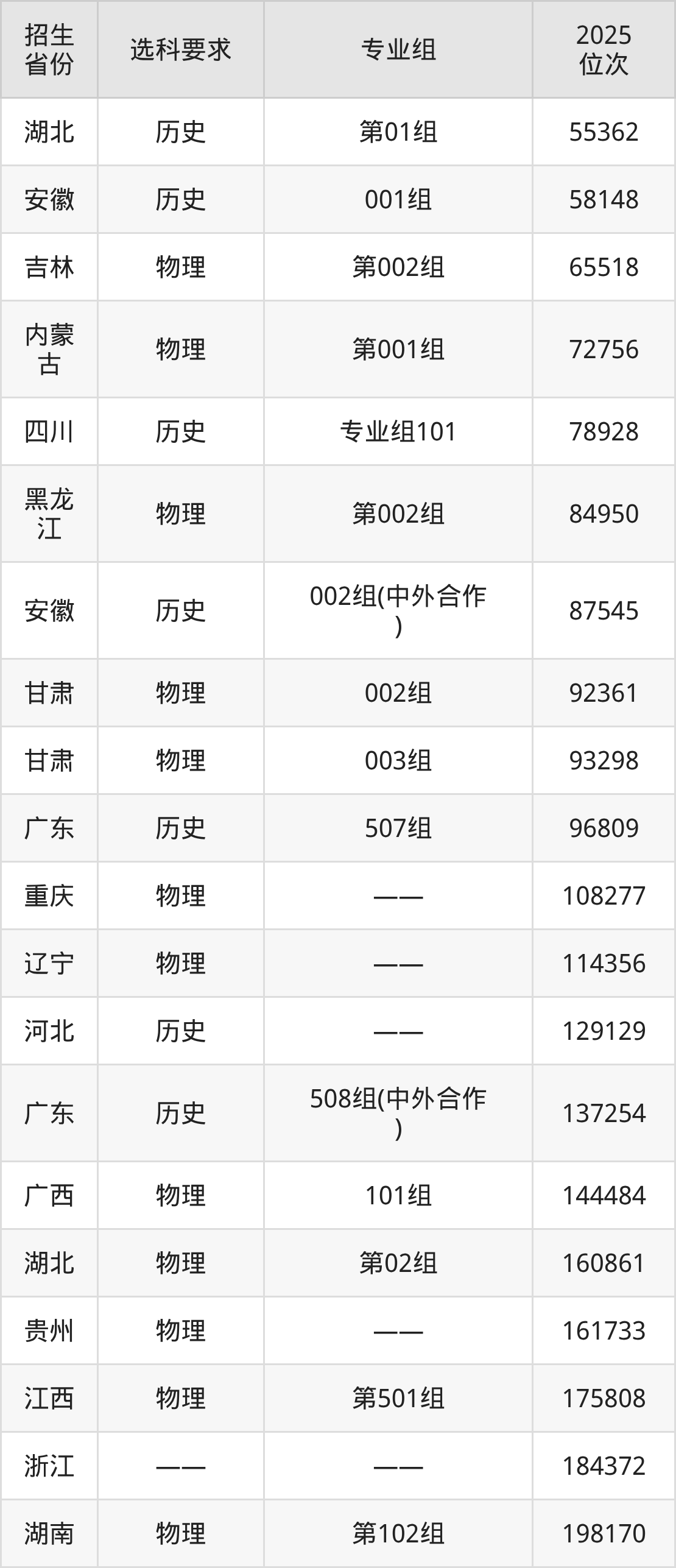 上海出版印刷高等專科學(xué)校2025年在全國(guó)各省的位次差異較大,最高位次是8205位(山西歷史類)、最低位次是361201位(山東)。各省具體位次請(qǐng)看下圖: