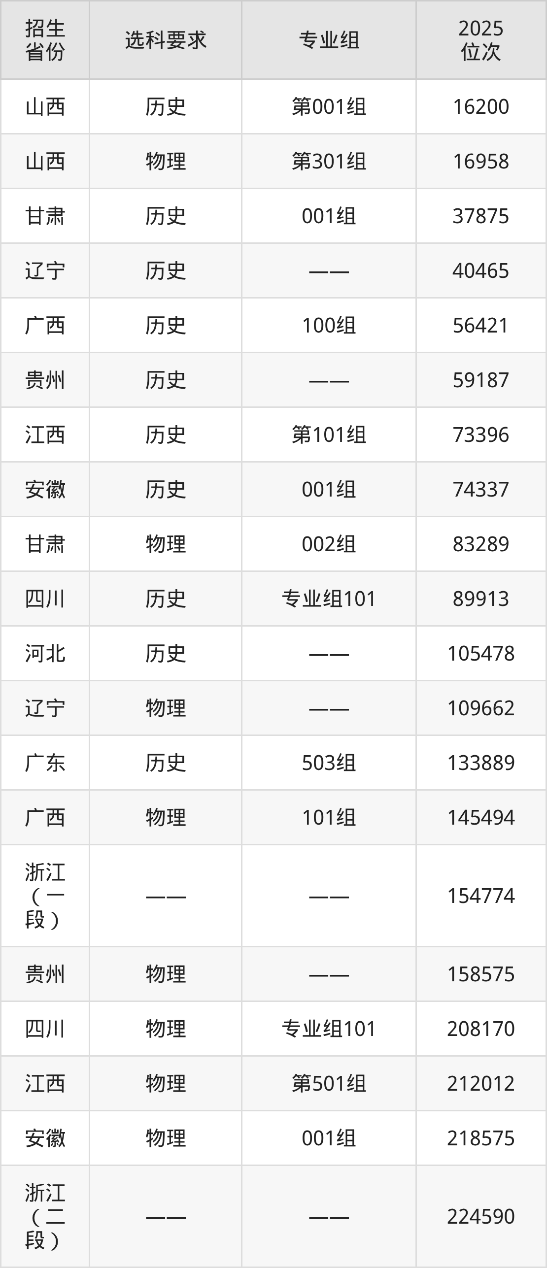 江西生物科技職業(yè)學院2025年在全國各省的位次差異較大,最高位次是16200位(山西歷史類)、最低位次是391272位(山東)。各省具體位次請看下圖: