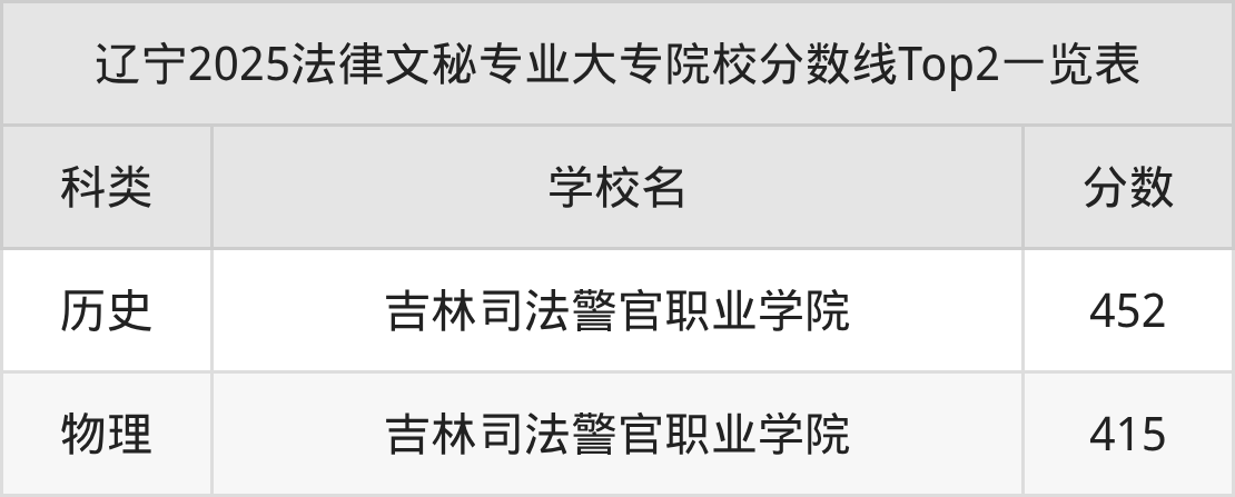 全國大專院校法律文秘專業(yè)歷史類最低收分為452分,對應(yīng)的招生院校是吉林司法警官職業(yè)學(xué)院。