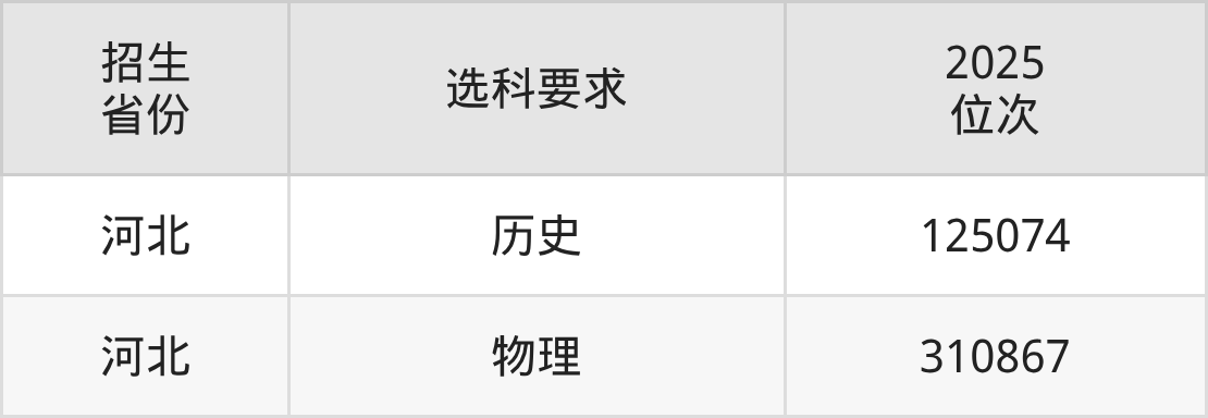 河北藝術(shù)職業(yè)學院2025年的位次差異較大,最高位次是125074位(河北歷史類)、最低位次是310867位(河北物理類)。具體位次請看下圖: