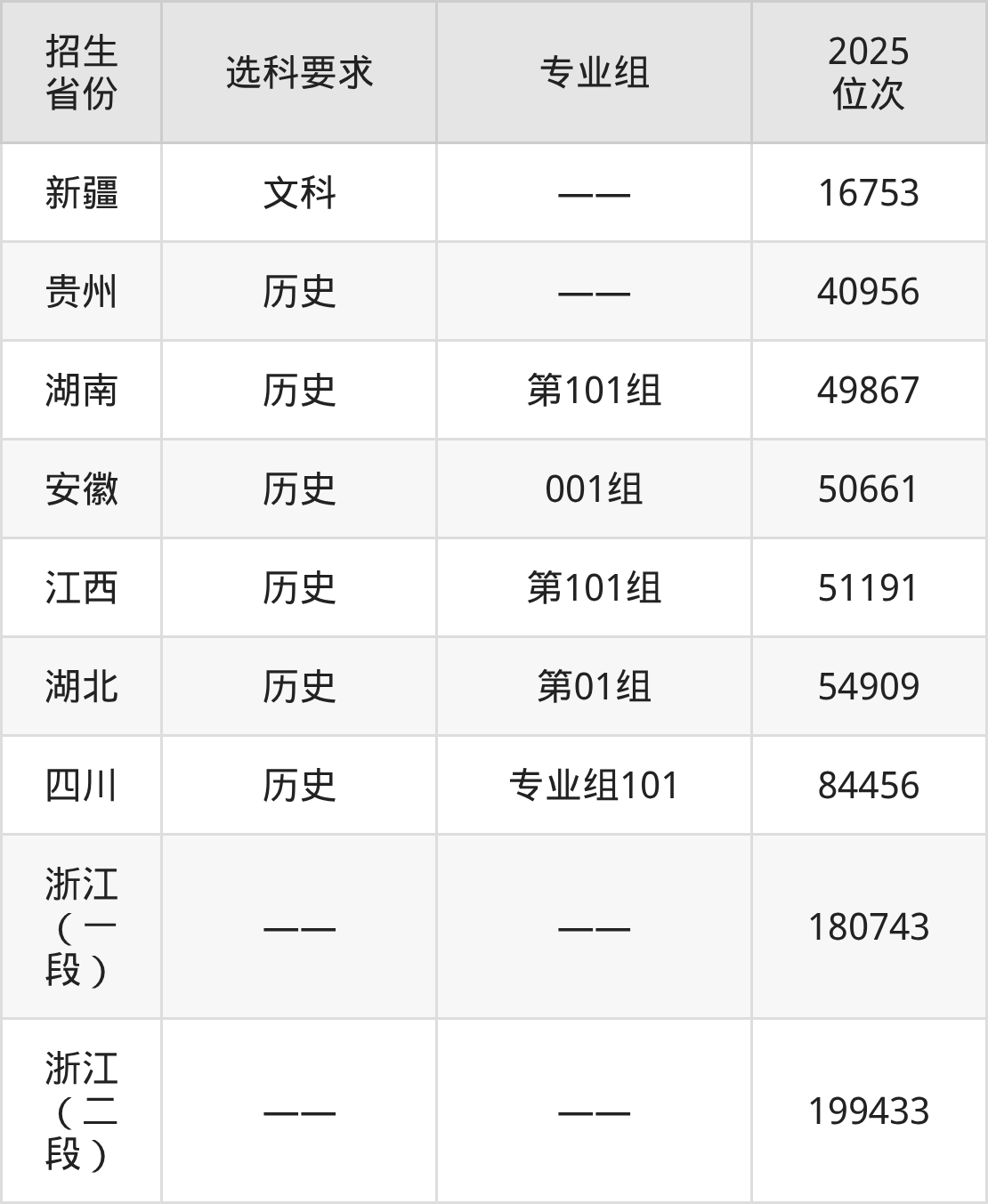 浙江特殊教育職業(yè)學(xué)院2025年在全國各省的位次差異較大,最高位次是16753位(新疆文科)、最低位次是199433位(浙江)。各省具體位次請看下圖: