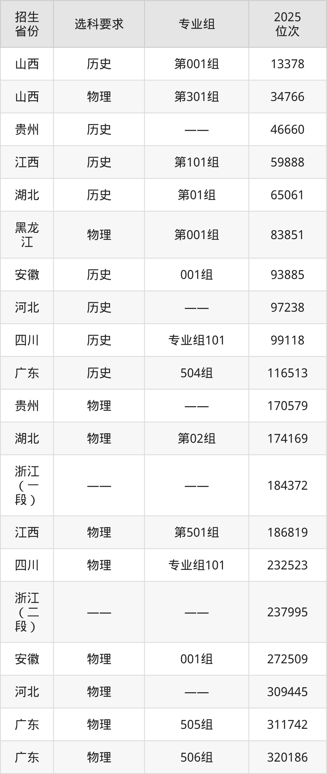淮南聯(lián)合大學(xué)2025年在全國各省的位次差異較大,最高位次是13378位(山西歷史類)、最低位次是414091位(山東)。各省具體位次請看下圖: