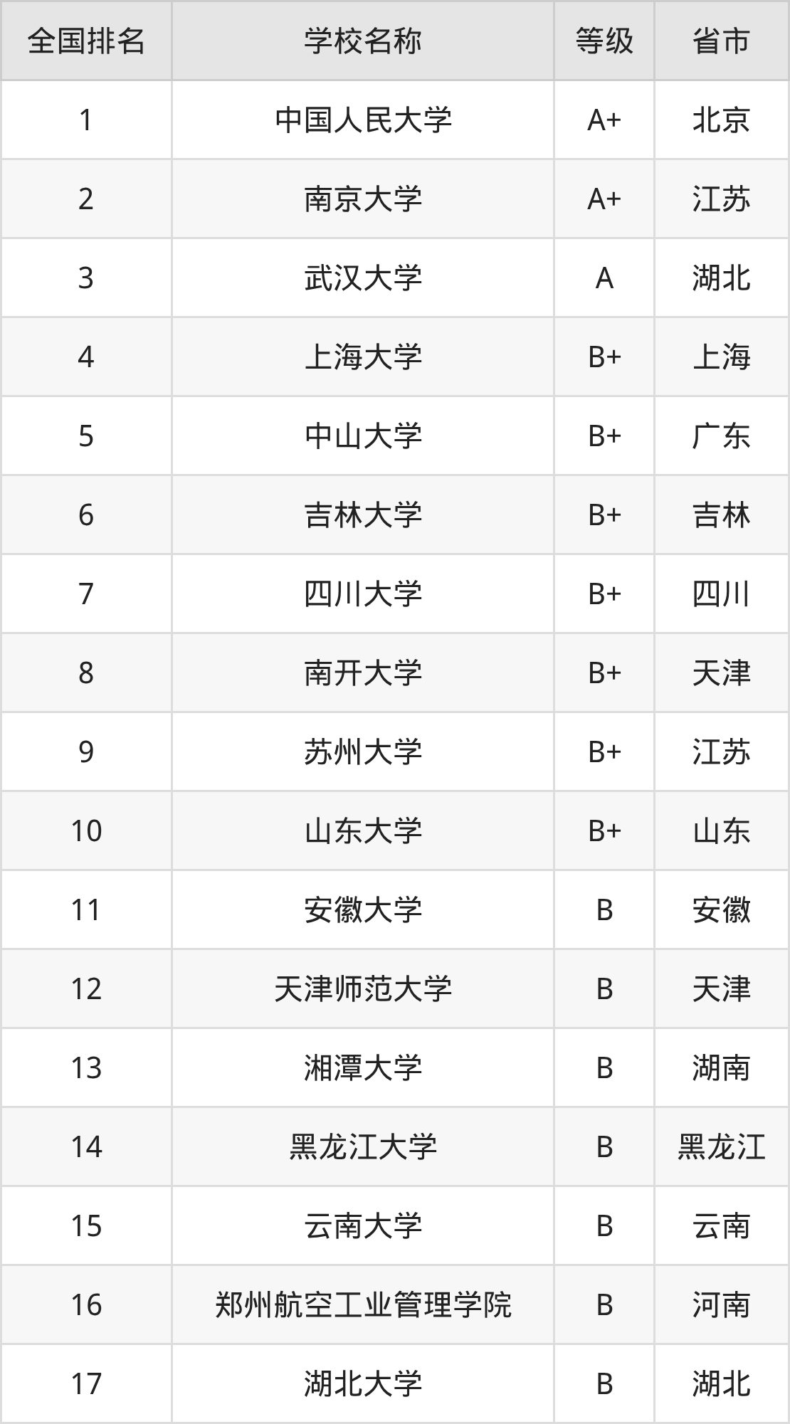 全國檔案學(xué)開設(shè)院校參與排名的共有17所,實力最強的是中國人民大學(xué)(全國排名第1名),其專業(yè)實力等級被評為A+級。