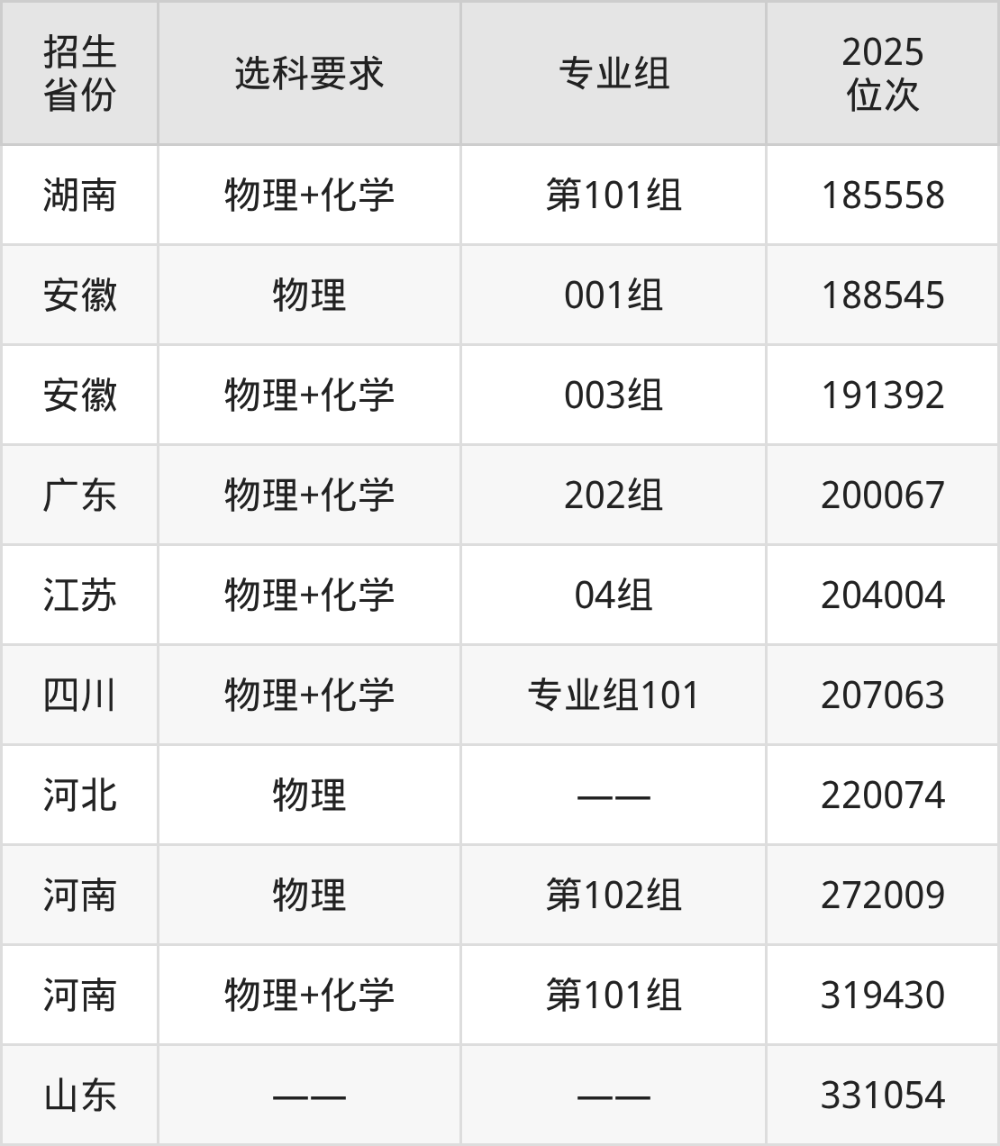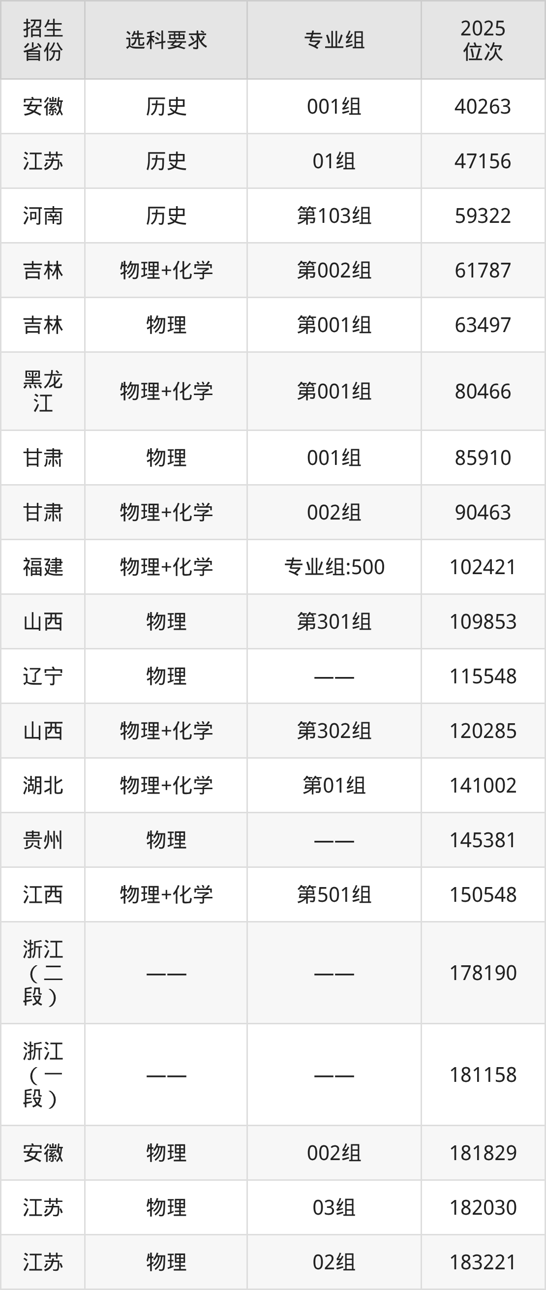 皖江工學院2025年在全國各省的位次差異較大,最高位次是40263位(安徽歷史類)、最低位次是331054位(山東)。各省具體位次請看下圖: