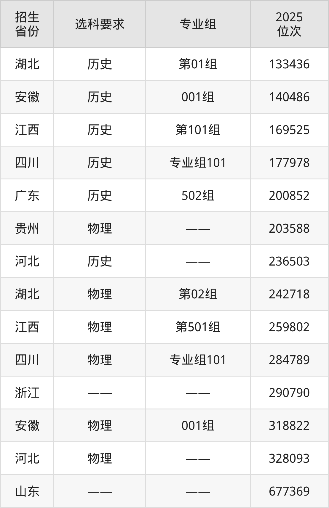 瀟湘職業(yè)學(xué)院2025年在全國各省的位次差異較大,最高位次是133436位(湖北歷史類)、最低位次是677369位(山東)。各省具體位次請(qǐng)看下圖: