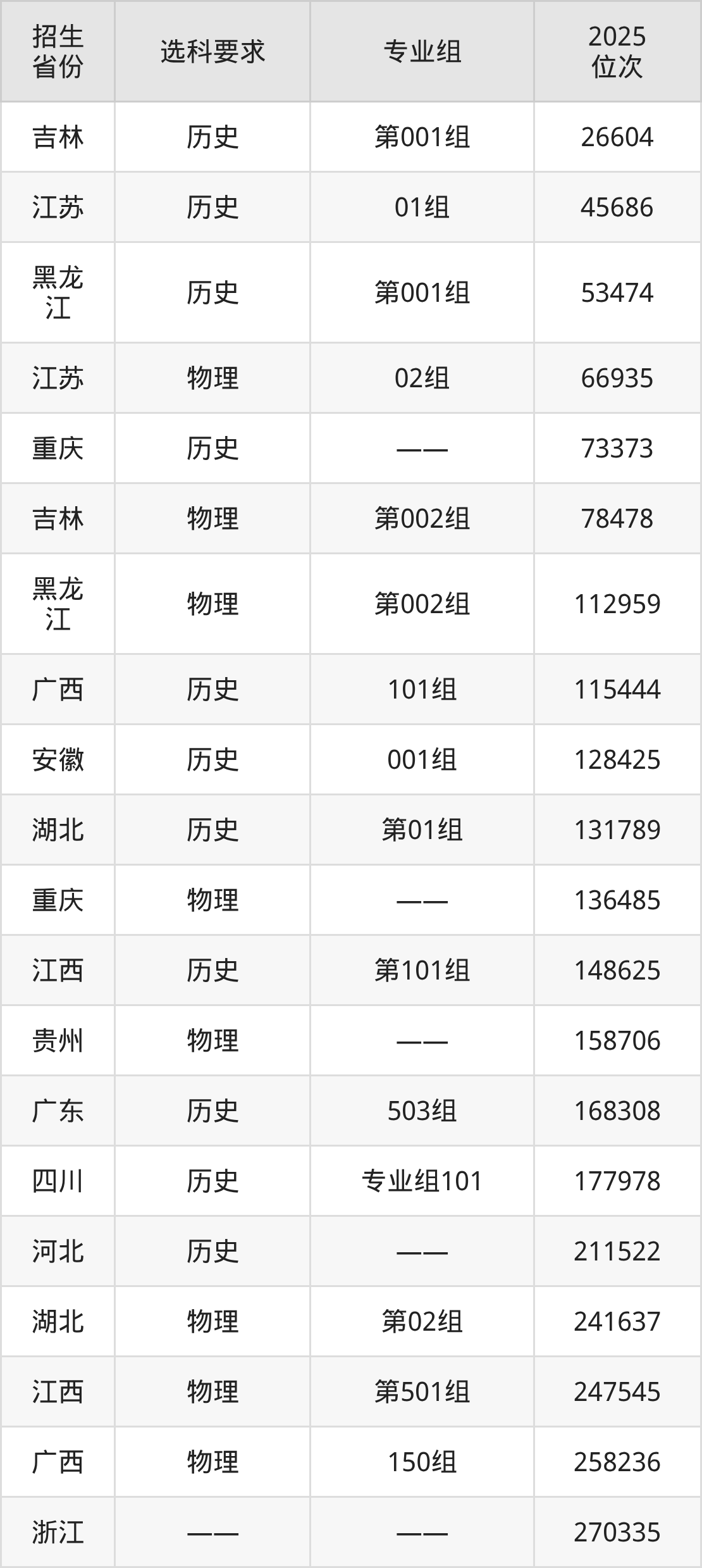 泉州輕工職業(yè)學(xué)院2025年在全國各省的位次差異較大,最高位次是26604位(吉林歷史類)、最低位次是665581位(山東)。各省具體位次請看下圖: