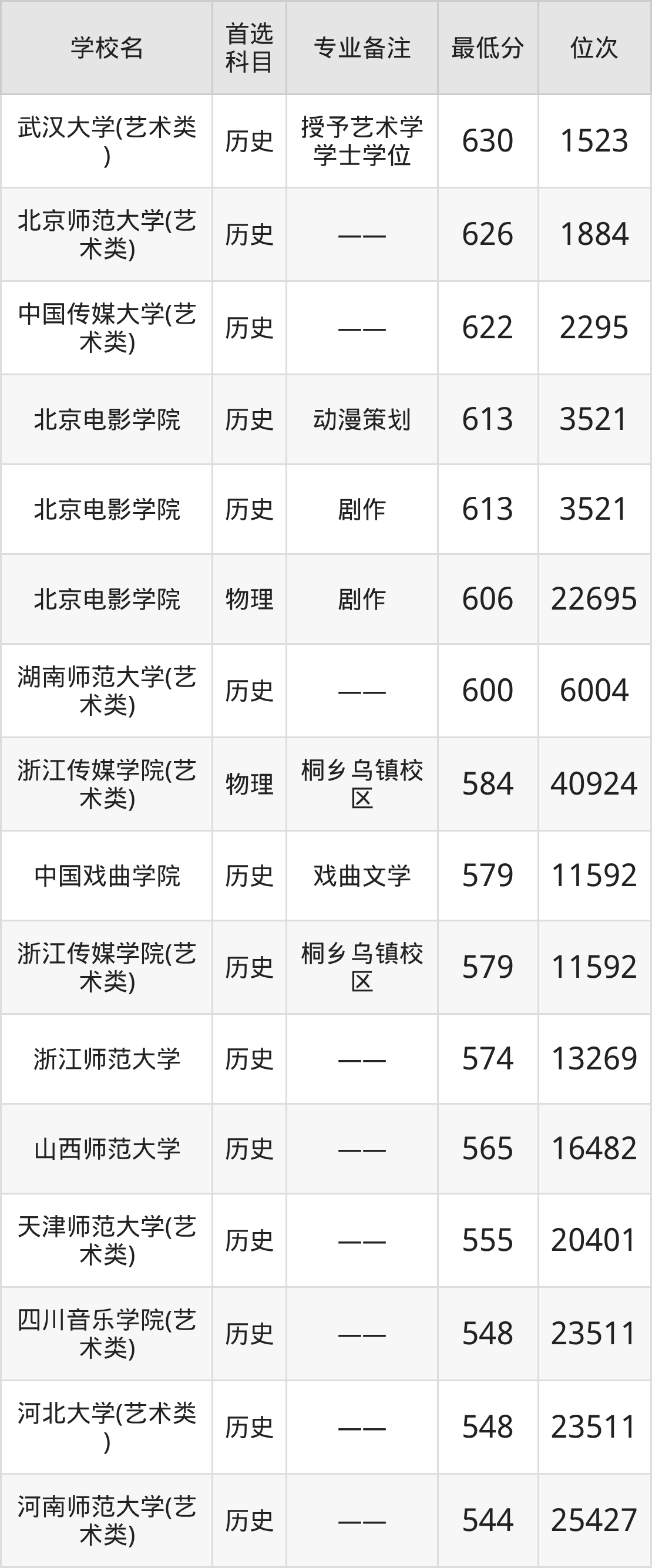 600分左右的戲劇影視文學(xué)大學(xué)有:湖南師范大學(xué)(藝術(shù)類)600分、北京電影學(xué)院606分。