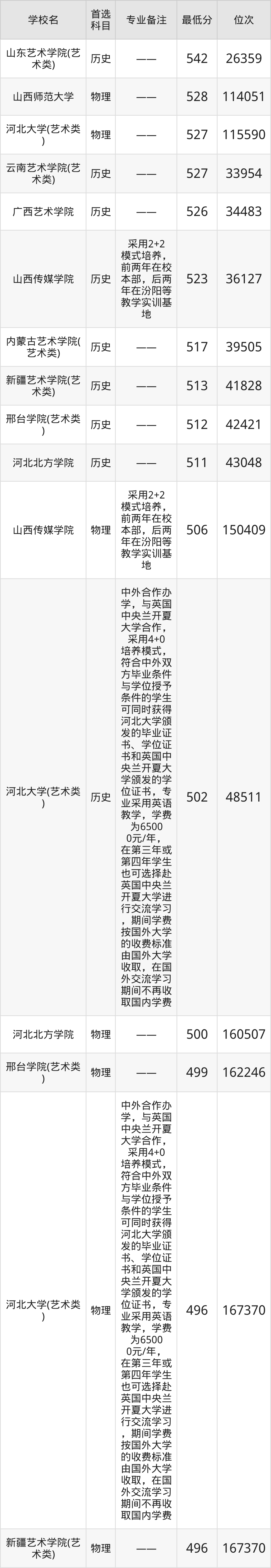 分?jǐn)?shù)線低于510分能上的戲劇影視文學(xué)大學(xué)還有河北大學(xué)(藝術(shù)類)(502分)、河北北方學(xué)院(500分)、邢臺(tái)學(xué)院(藝術(shù)類)(499分)、河北大學(xué)(藝術(shù)類)(496分)。
