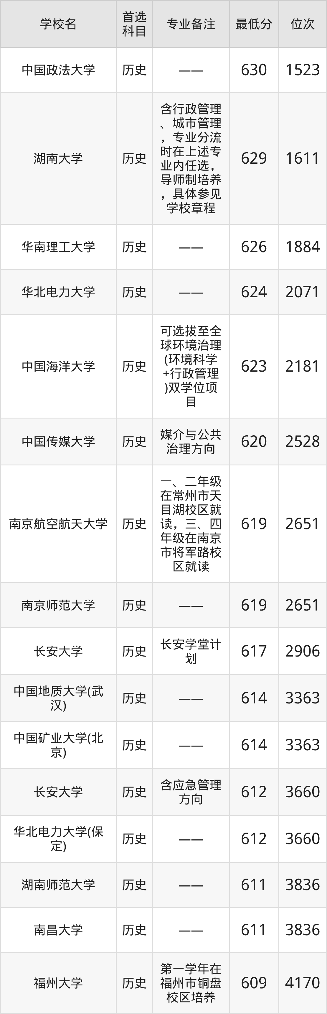 行政管理分?jǐn)?shù)線排名前五的院校分別是:630分的中國政法大學(xué)、629分的湖南大學(xué)(含行政管理、城市管理,專業(yè)分流時(shí)在上述專業(yè)內(nèi)任選,導(dǎo)師制培養(yǎng),具體參見學(xué)校章程)、626分的華南理工大學(xué)、624分的華北電力大學(xué)、623分的中國海洋大學(xué)(可選拔至全球環(huán)境治理(環(huán)境科學(xué)+行政管理)雙學(xué)位項(xiàng)目)。