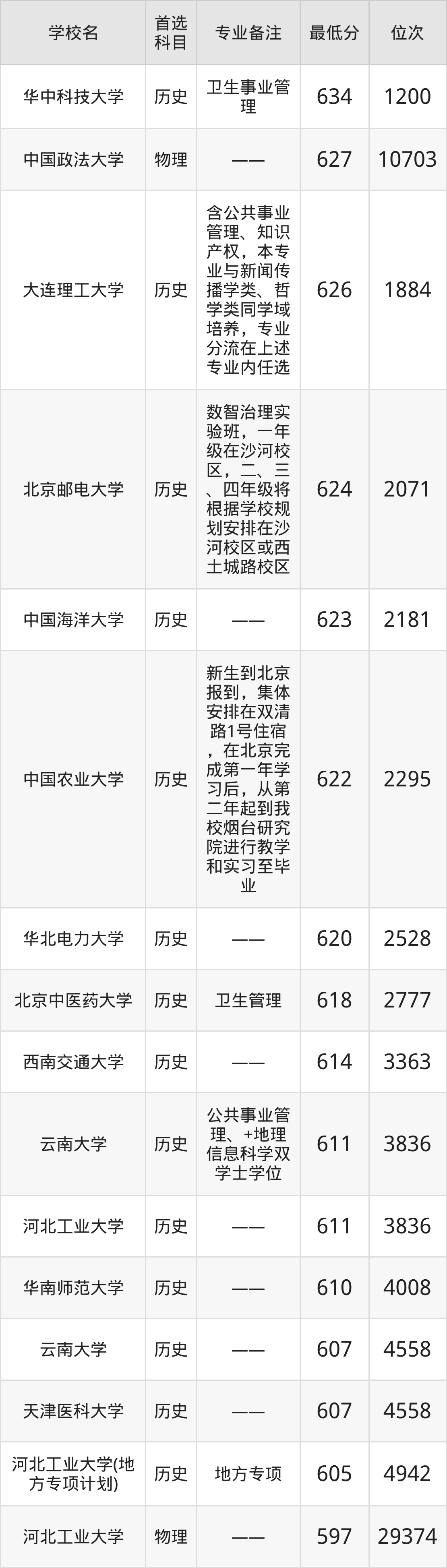 600分左右的公共事業(yè)管理大學有:河北工業(yè)大學597分、河北工業(yè)大學(地方專項計劃)605分、云南大學607分、天津醫(yī)科大學607分。