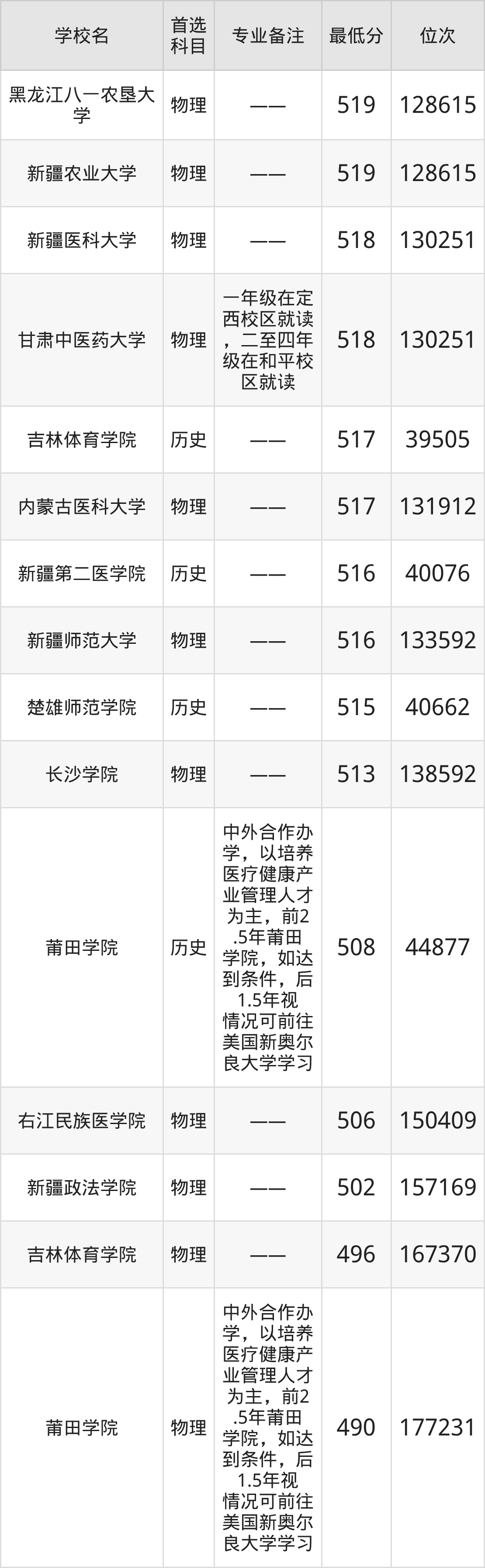 分數(shù)線低于510分能上的公共事業(yè)管理大學還有莆田學院(508分)、右江民族醫(yī)學院(506分)、新疆政法學院(502分)、吉林體育學院(496分)。