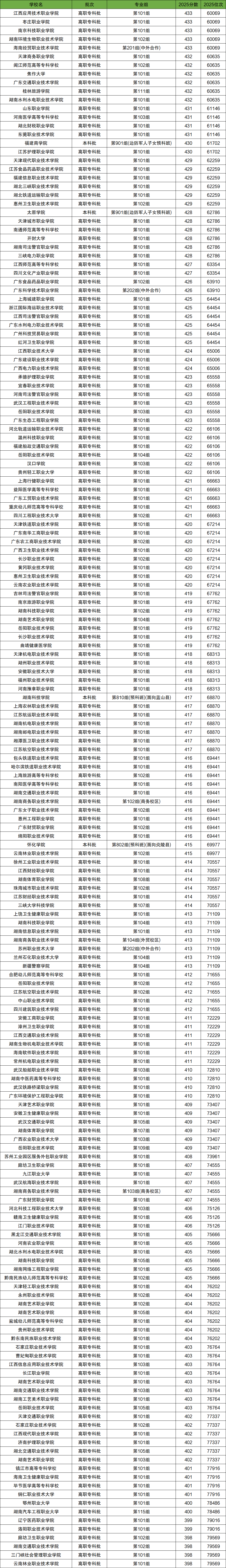 2025年全國大學在湖南省高考錄取位次在6萬名~8萬名之間的學校有157所,對應的分數(shù)為433分~398分,對應湖南全省高考排名區(qū)間為60069-79569。