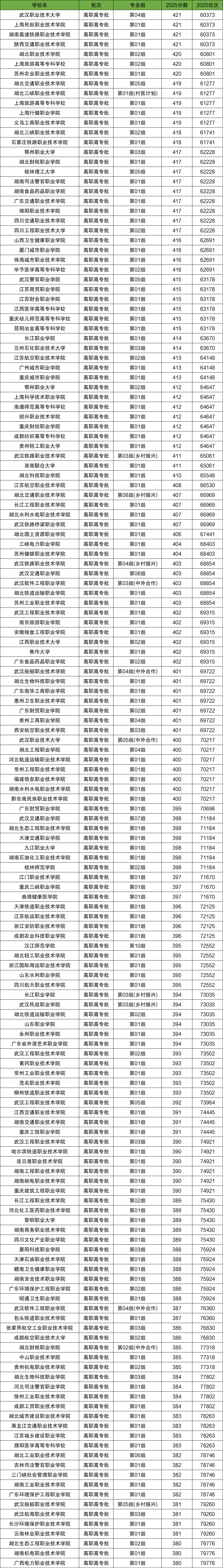 2025年全國大學(xué)在湖北省高考錄取位次在6萬名~8萬名之間的學(xué)校有138所,對應(yīng)的分?jǐn)?shù)為421分~380分,對應(yīng)湖北全省高考排名區(qū)間為60373-79776。