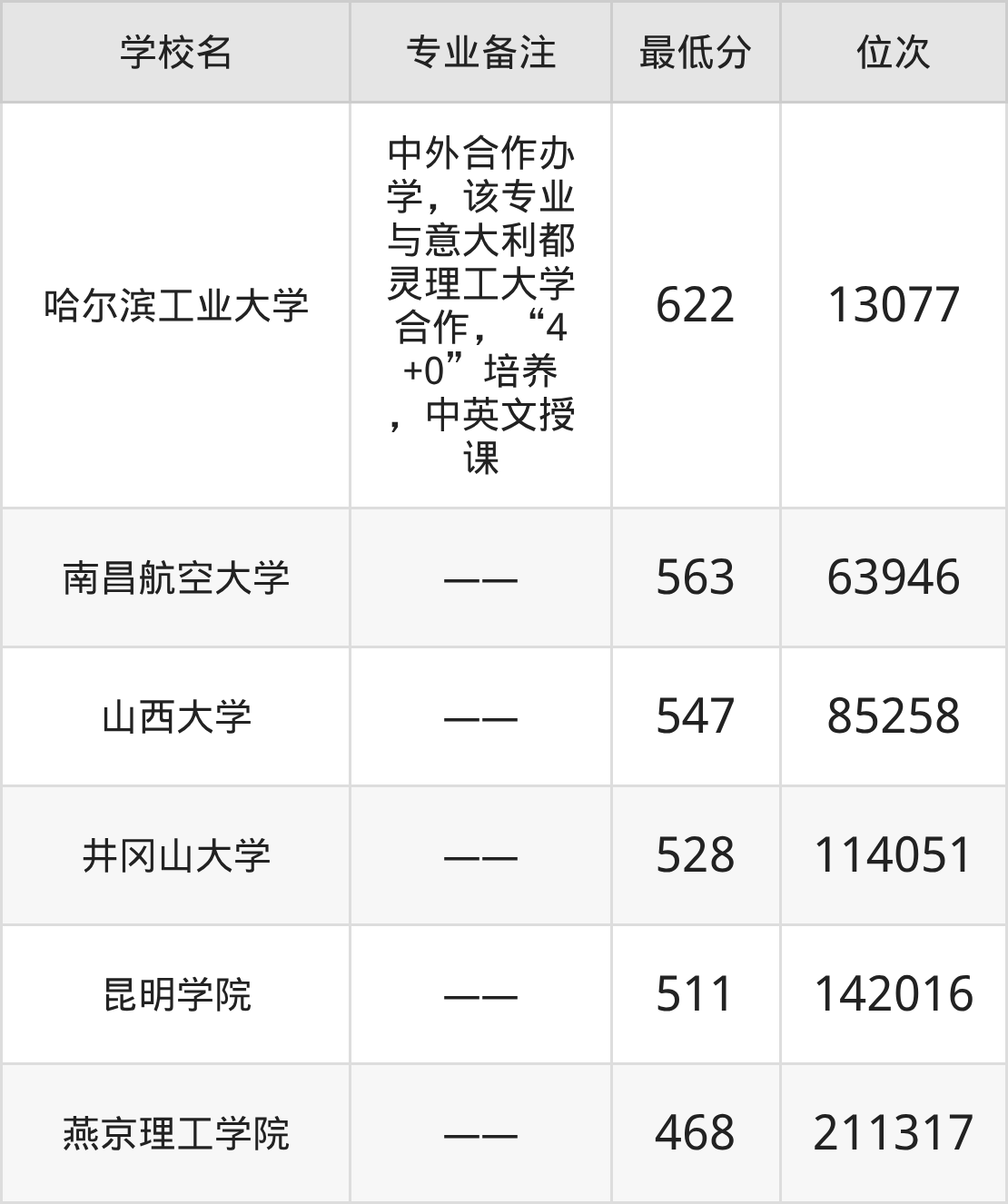 智慧建筑與建造分數線排名前五的院校分別是:622分的哈爾濱工業(yè)大學(中外合作辦學,該專業(yè)與意大利都靈理工大學合作,“4+0”培養(yǎng),中英文授課)、563分的南昌航空大學、547分的山西大學、528分的井岡山大學、511分的昆明學院。