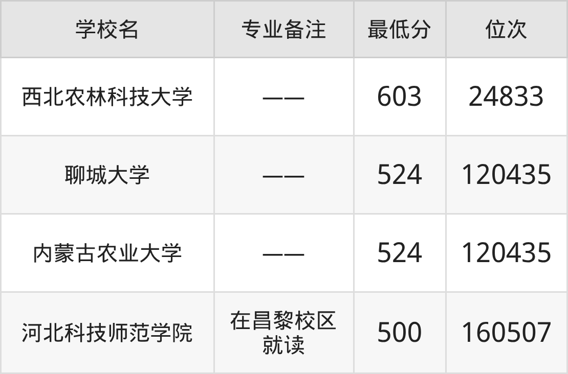 智慧牧業(yè)科學(xué)與工程最難考的大學(xué)是西北農(nóng)林科技大學(xué),2025年最低分603分;智慧牧業(yè)科學(xué)與工程最好考的大學(xué)是河北科技師范學(xué)院(在昌黎校區(qū)就讀),2025最低分500分。