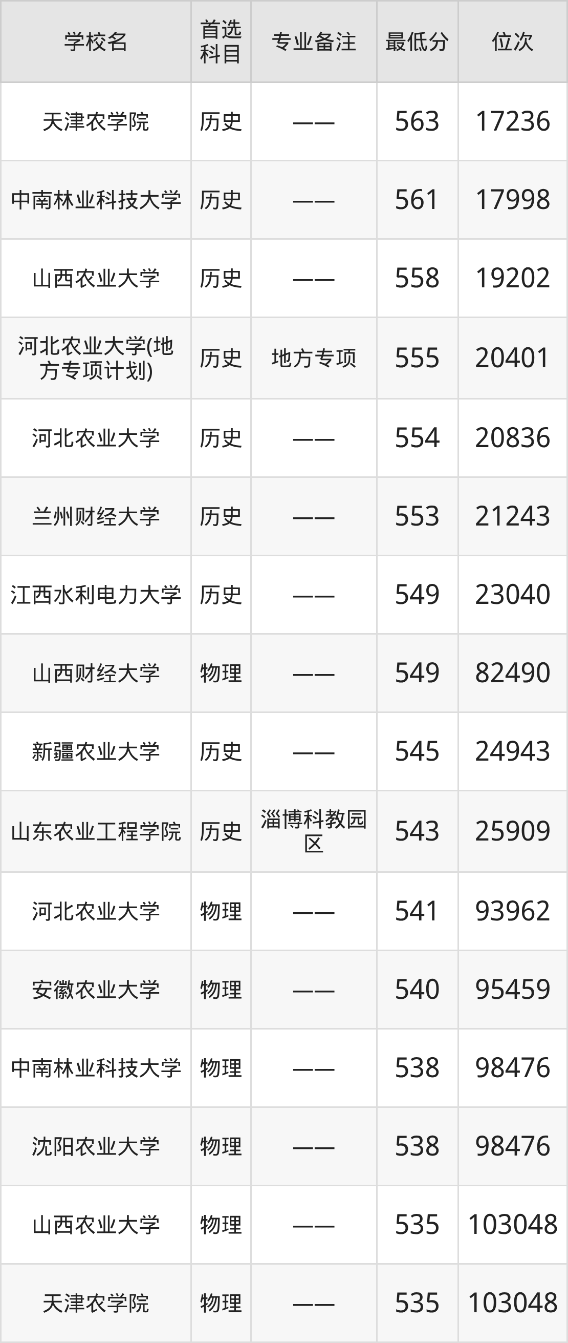 分?jǐn)?shù)線低于520分能上的農(nóng)林經(jīng)濟(jì)管理大學(xué)還有西藏農(nóng)牧大學(xué)(519分)、塔里木大學(xué)(507分)、福建農(nóng)林大學(xué)(503分)、河北北方學(xué)院(502分)。