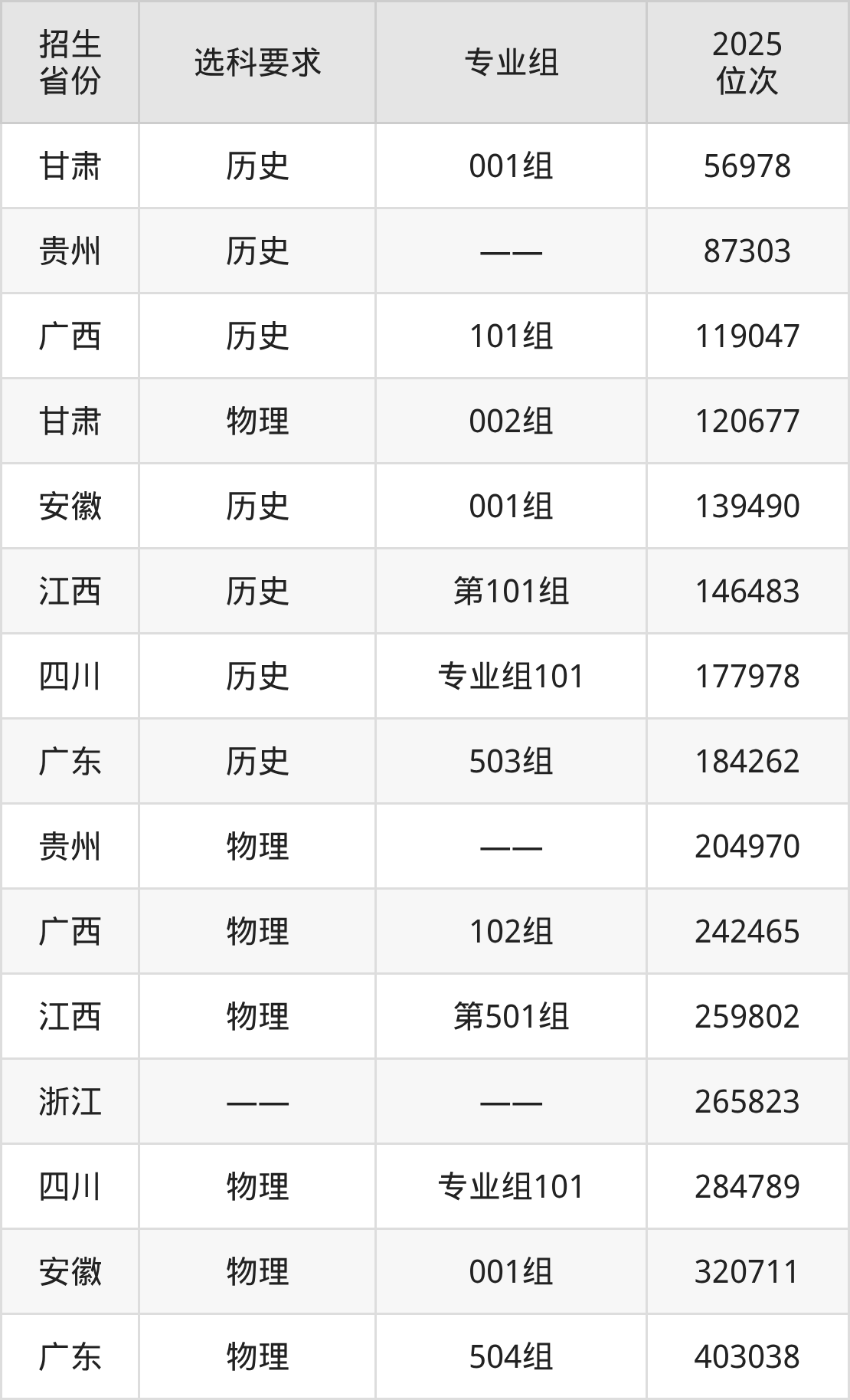 福州英華職業(yè)學院2025年在全國各省的位次差異較大,最高位次是56978位(甘肅歷史類)、最低位次是403038位(廣東物理類)。各省具體位次請看下圖: