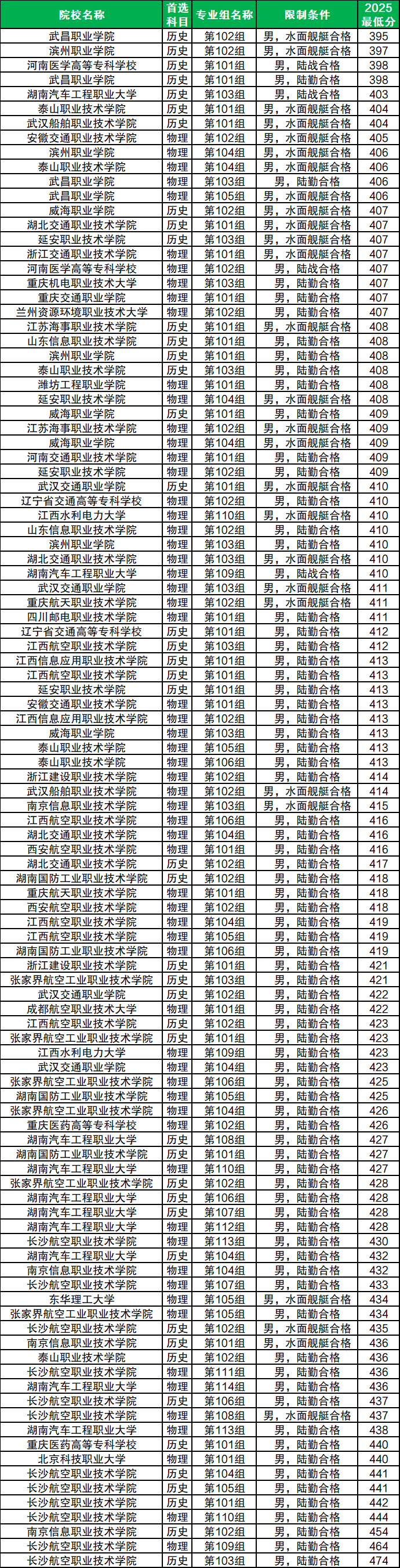 歷史類男生士官學(xué)校最低分是395分,對(duì)應(yīng)最低分院校是武昌職業(yè)學(xué)院102組,要求水面艦艇合格。