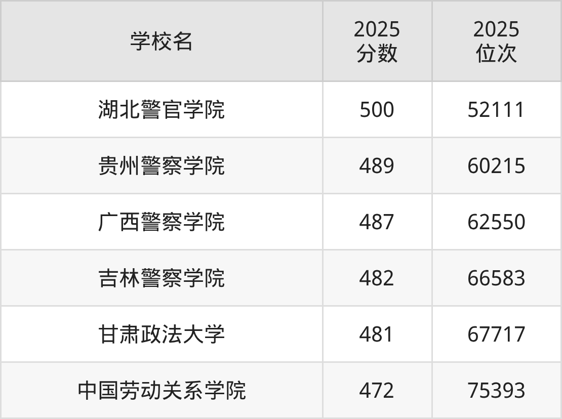 溫馨提示:全國(guó)各省錄取分?jǐn)?shù)線不相同,本文以貴州省為例,為大家?guī)?lái)2025年錄取分?jǐn)?shù)線位于470到500分的政法大學(xué)名單匯總,并附上該分?jǐn)?shù)段對(duì)應(yīng)的位次排名區(qū)間,供查閱。