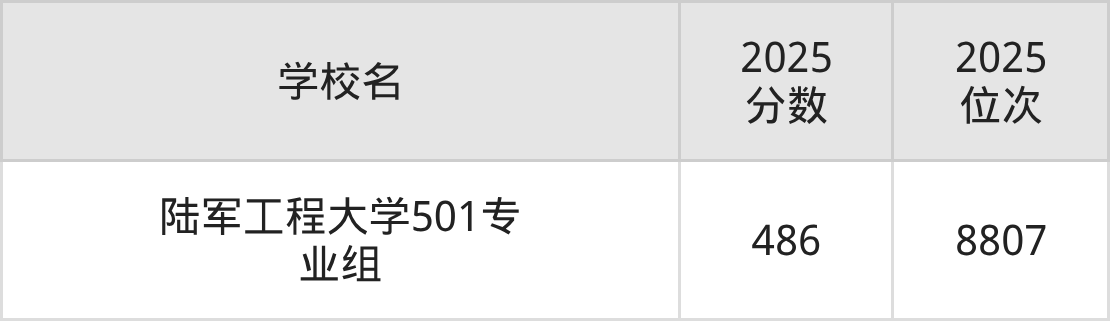 物理類470到490分的大學(xué)中分?jǐn)?shù)對(duì)應(yīng)位次最低的是陸軍工程大學(xué)501專業(yè)組,2025年最低分486分,對(duì)應(yīng)最低位次是8807名。