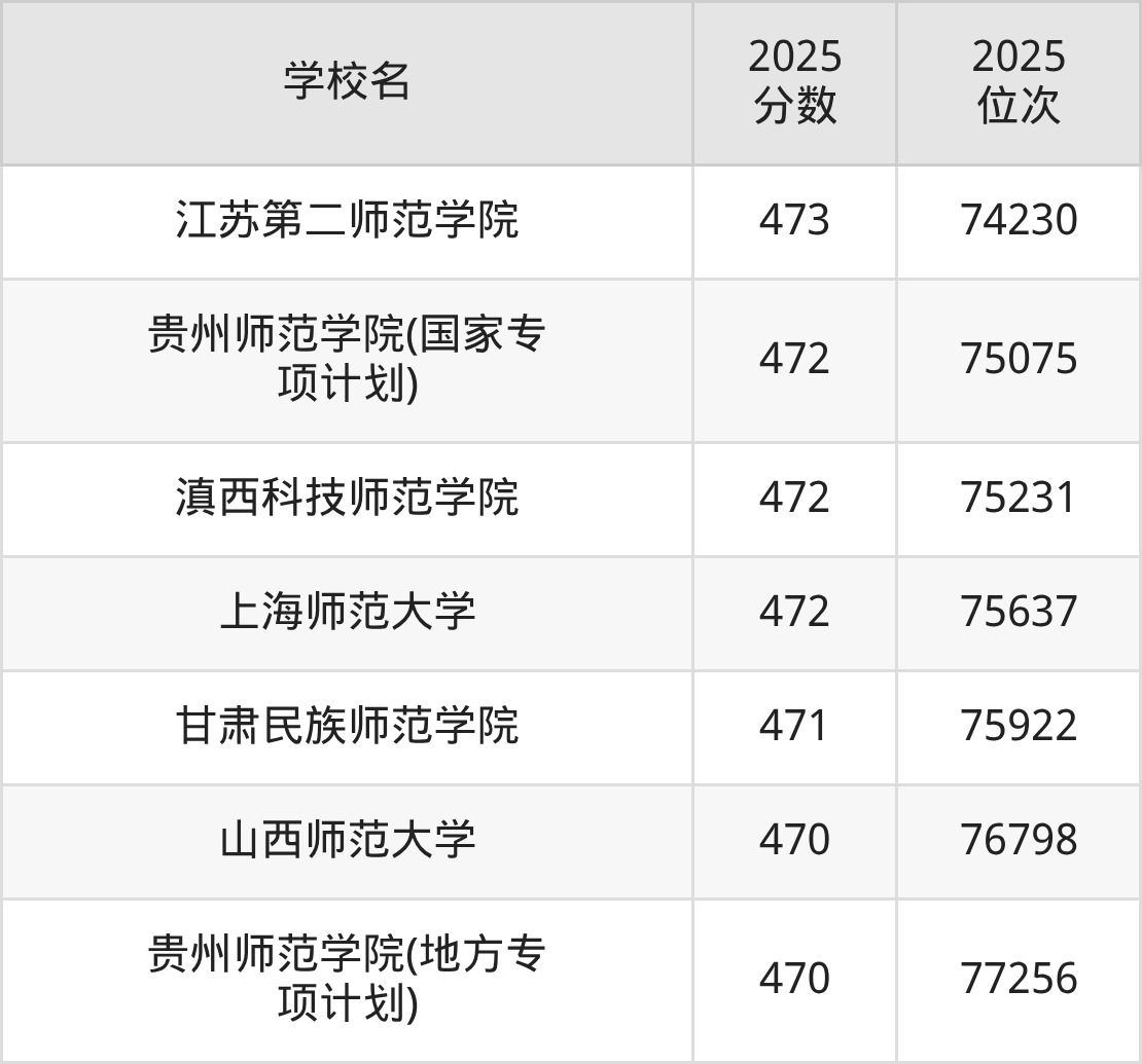 溫馨提示:全國(guó)各省錄取分?jǐn)?shù)線不相同,本文以貴州省為例,為大家?guī)?lái)2025年錄取分?jǐn)?shù)線位于470到490分的師范大學(xué)名單匯總,并附上該分?jǐn)?shù)段對(duì)應(yīng)的位次排名區(qū)間,供查閱。