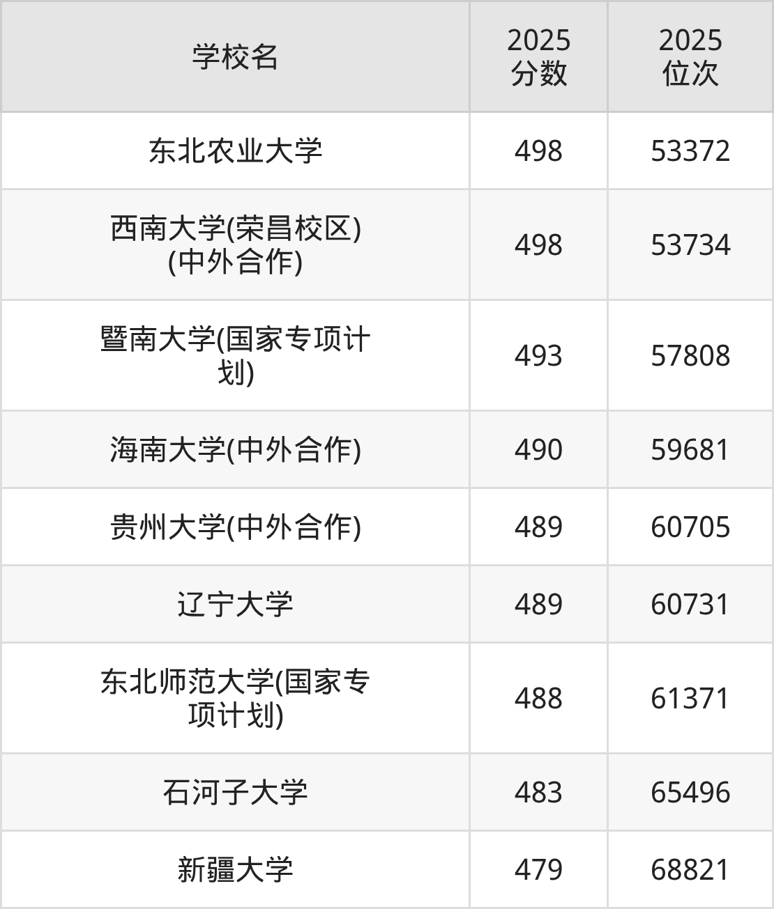 物理類470到500分的大學(xué)中分?jǐn)?shù)對(duì)應(yīng)位次最高的是東北農(nóng)業(yè)大學(xué),2025年最低分498分,對(duì)應(yīng)最低位次是53372名;分?jǐn)?shù)對(duì)應(yīng)位次最低的是新疆大學(xué),2025年最低分479分,對(duì)應(yīng)最低位次是68821名。