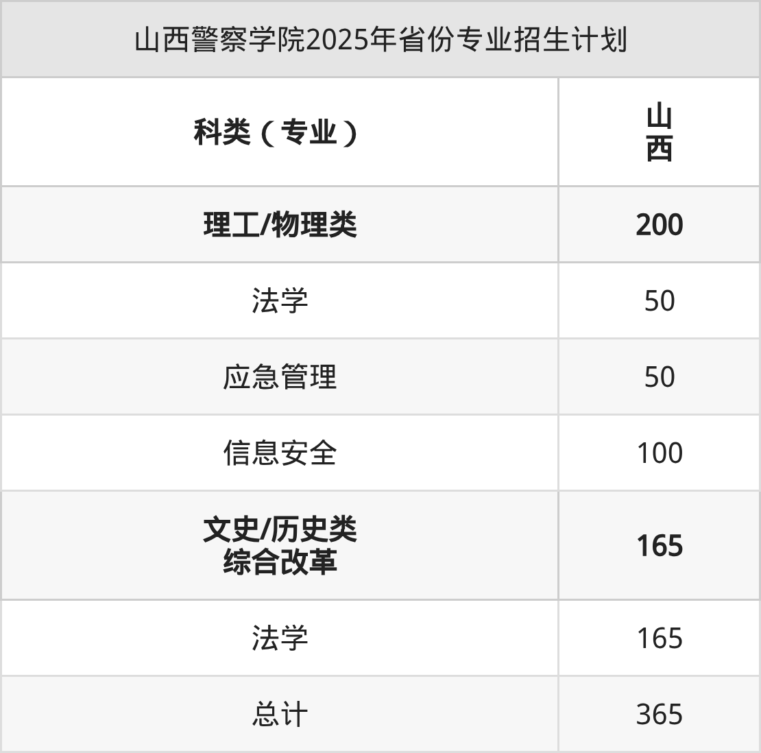 2025年山西警察學(xué)院計(jì)劃招收本科生365人,其中法學(xué)專業(yè)215人,應(yīng)急管理專業(yè)50人,信息安全專業(yè)100人。