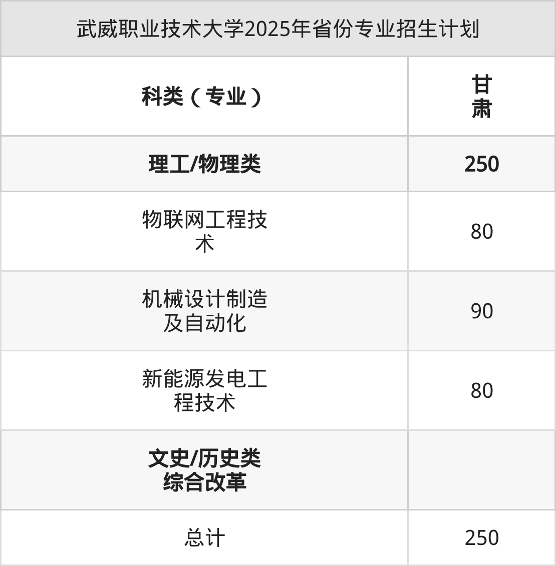 2025年武威職業(yè)技術(shù)大學(xué)計(jì)劃招收本科生250人,其中物聯(lián)網(wǎng)工程技術(shù)專業(yè)80人,機(jī)械設(shè)計(jì)制造及自動(dòng)化專業(yè)90人,新能源發(fā)電工程技術(shù)專業(yè)80人。
