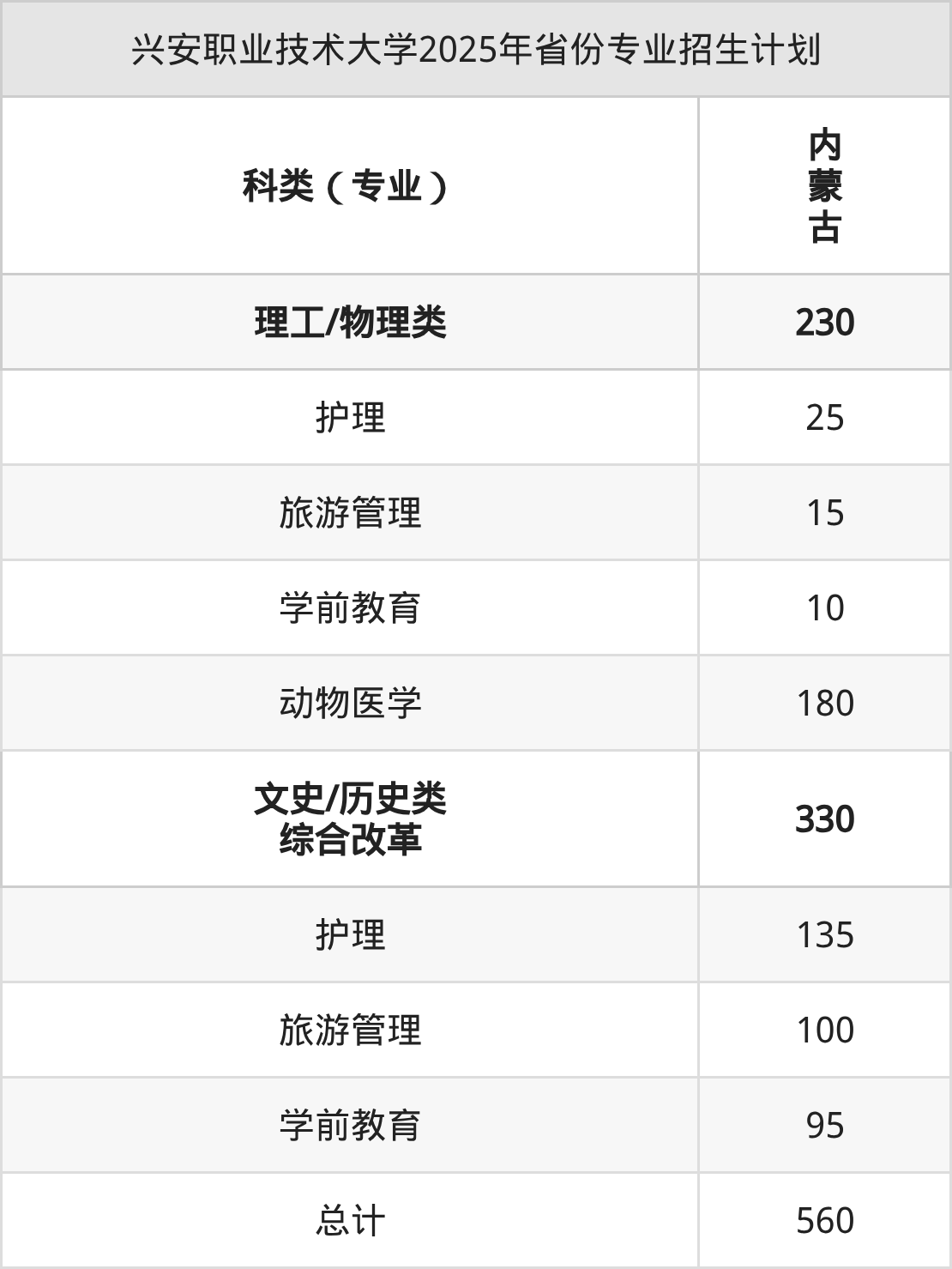 2025年興安職業(yè)技術(shù)大學(xué)計(jì)劃招收本科生560人,其中護(hù)理專業(yè)160人,旅游管理專業(yè)115人,學(xué)前教育專業(yè)105人,動(dòng)物醫(yī)學(xué)專業(yè)180人。