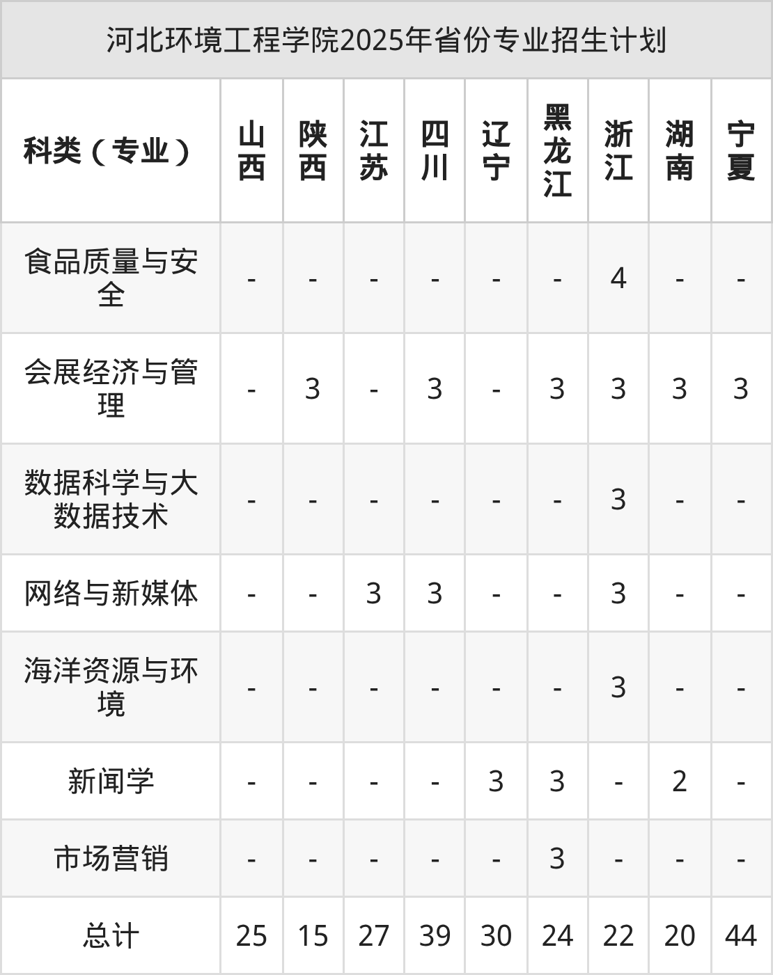 2025年河北環(huán)境工程學院計劃招收本科生2160人,其中環(huán)境科學專業(yè)65人,園林專業(yè)132人,國際商務專業(yè)132人,工程造價專業(yè)66人,網(wǎng)絡與新媒體專業(yè)66人等。