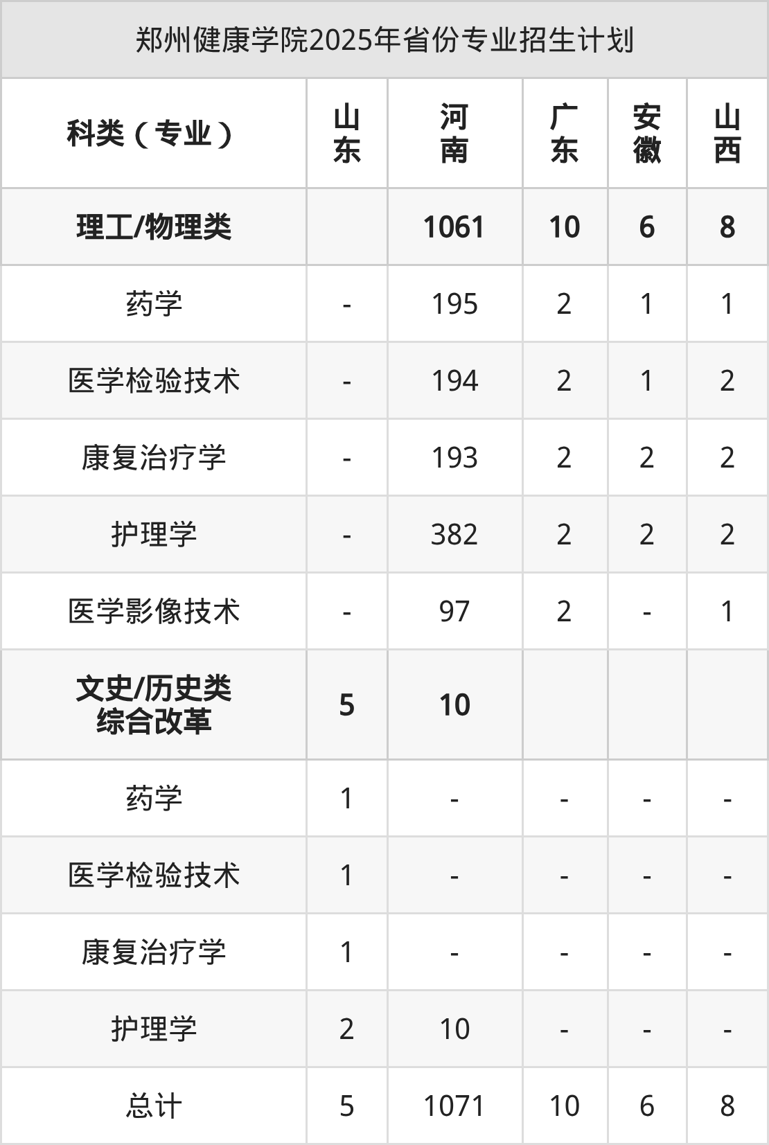 而各省份的招生計劃數(shù)為安徽6人,山西8人,山東5人,河南1071人,廣東10人。