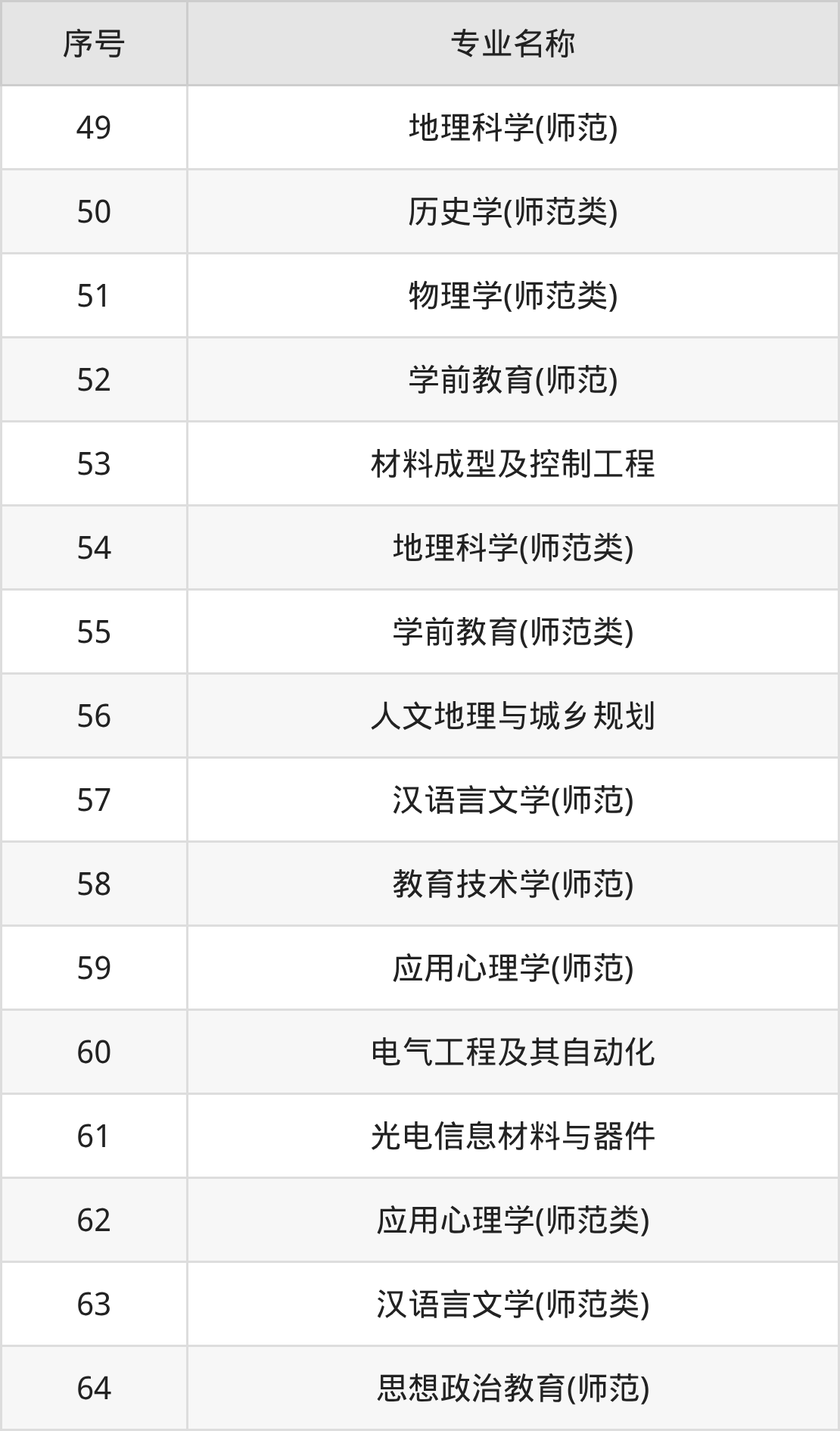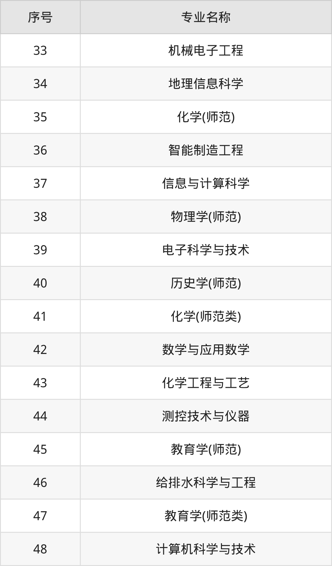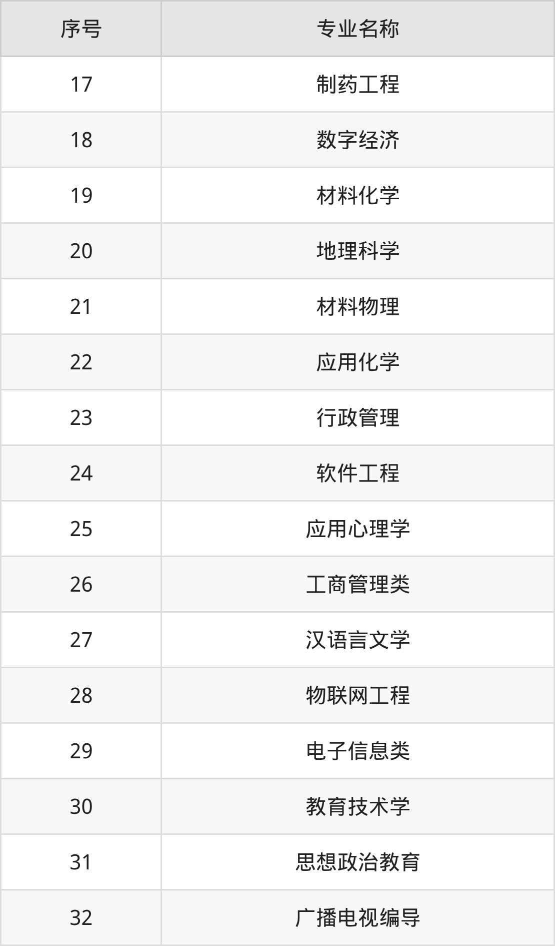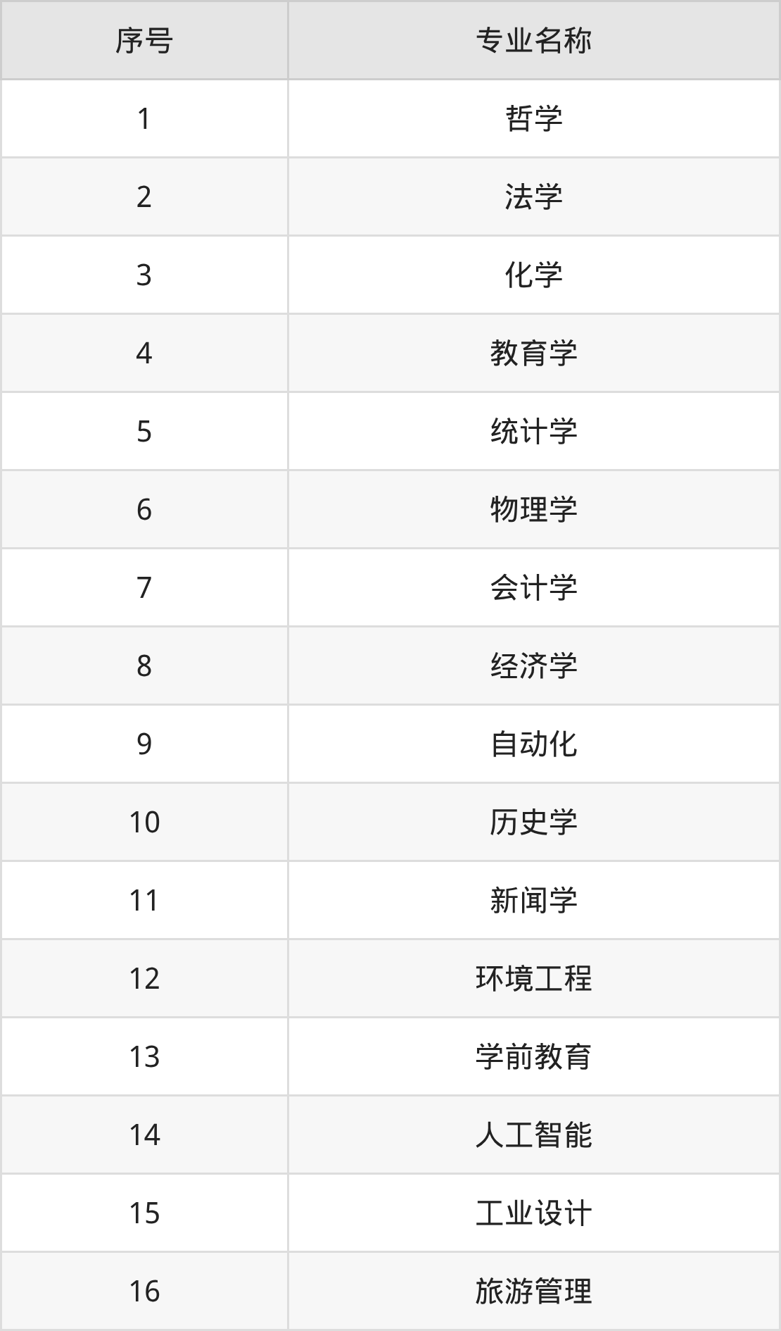 物理類(理科)本科招生專業(yè):化學(xué)、自動(dòng)化、經(jīng)濟(jì)學(xué)、物理學(xué)、會(huì)計(jì)學(xué)、統(tǒng)計(jì)學(xué)、地理科學(xué)、行政管理、材料化學(xué)、軟件工程等。