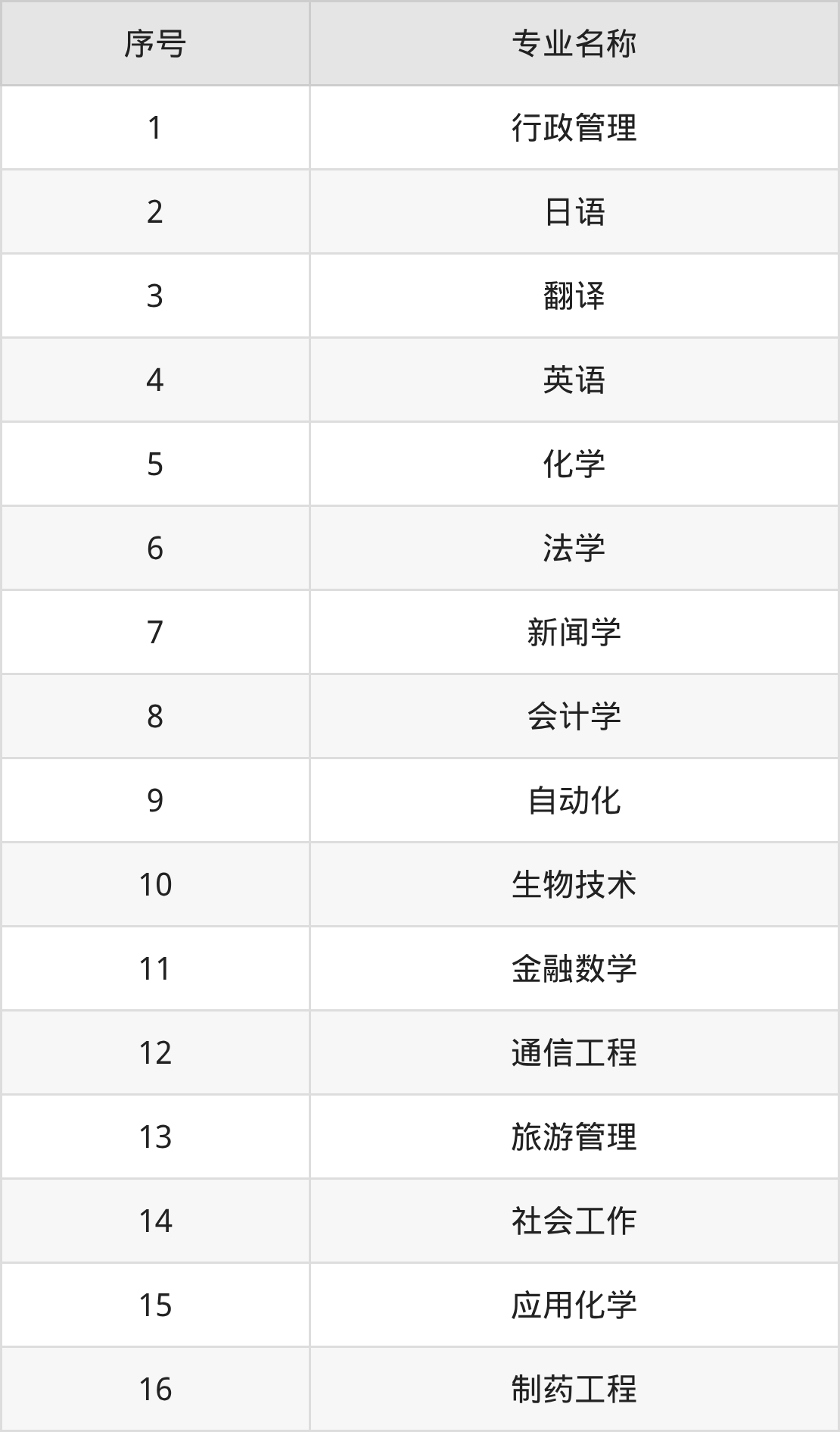 物理類(理科)本科招生專業(yè):翻譯、日語、化學(xué)、法學(xué)、自動(dòng)化、會(huì)計(jì)學(xué)、新聞學(xué)、通信工程、旅游管理、電子商務(wù)等。