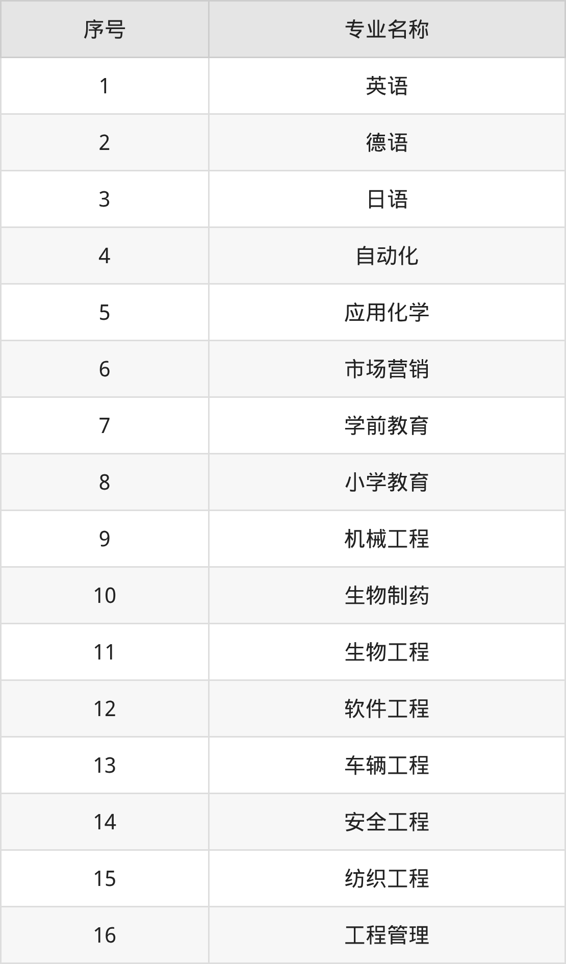 物理類(理科)本科招生專業(yè):德語(yǔ)、日語(yǔ)、英語(yǔ)、自動(dòng)化、市場(chǎng)營(yíng)銷、機(jī)械工程、軟件工程、車輛工程、工程管理、紡織工程等。