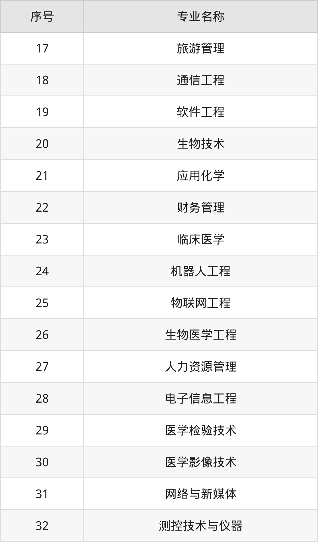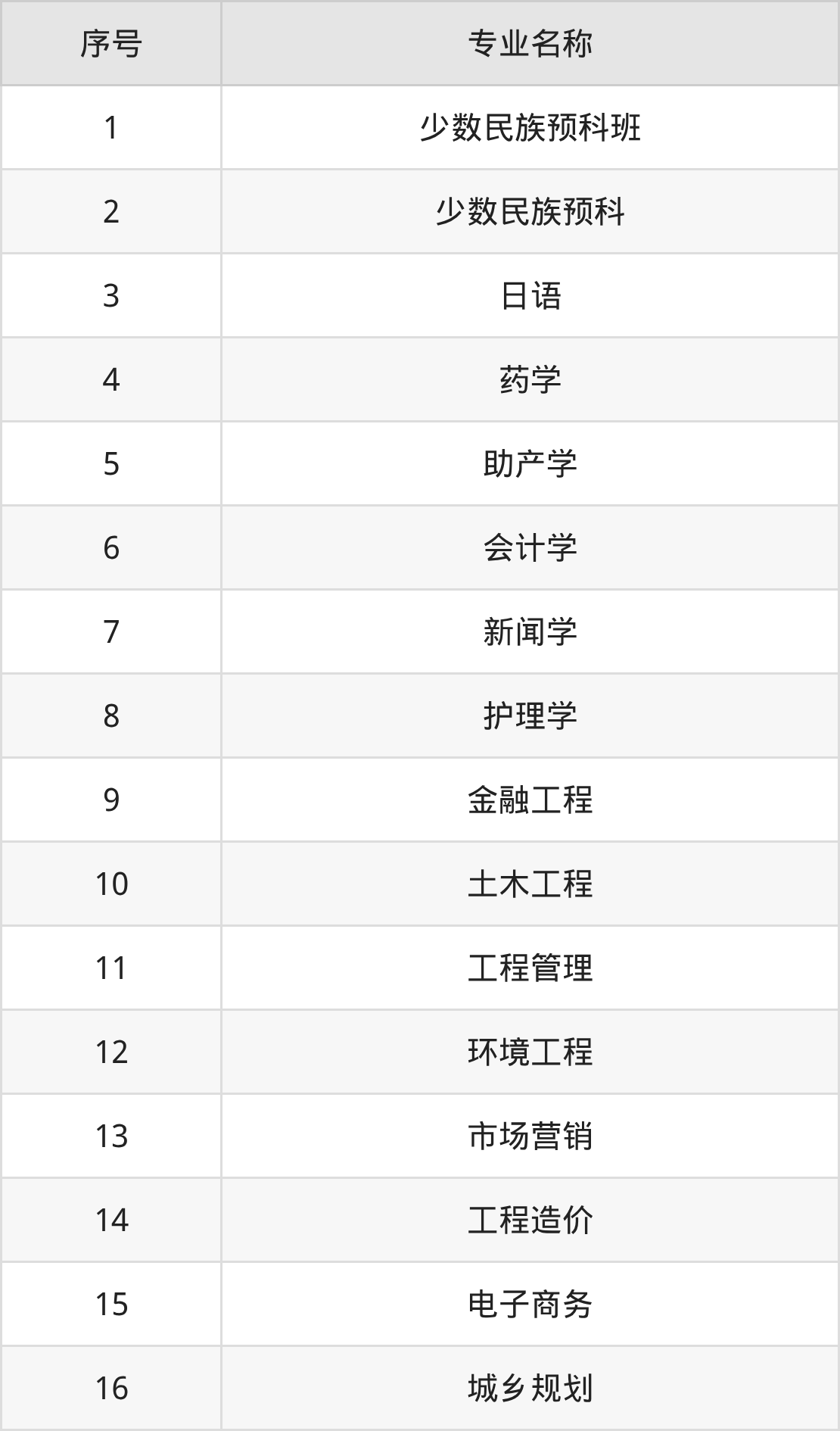 物理類(理科)本科招生專業(yè):藥學(xué)、日語、會(huì)計(jì)學(xué)、新聞學(xué)、助產(chǎn)學(xué)、護(hù)理學(xué)、工程造價(jià)、通信工程、臨床醫(yī)學(xué)、環(huán)境工程等。