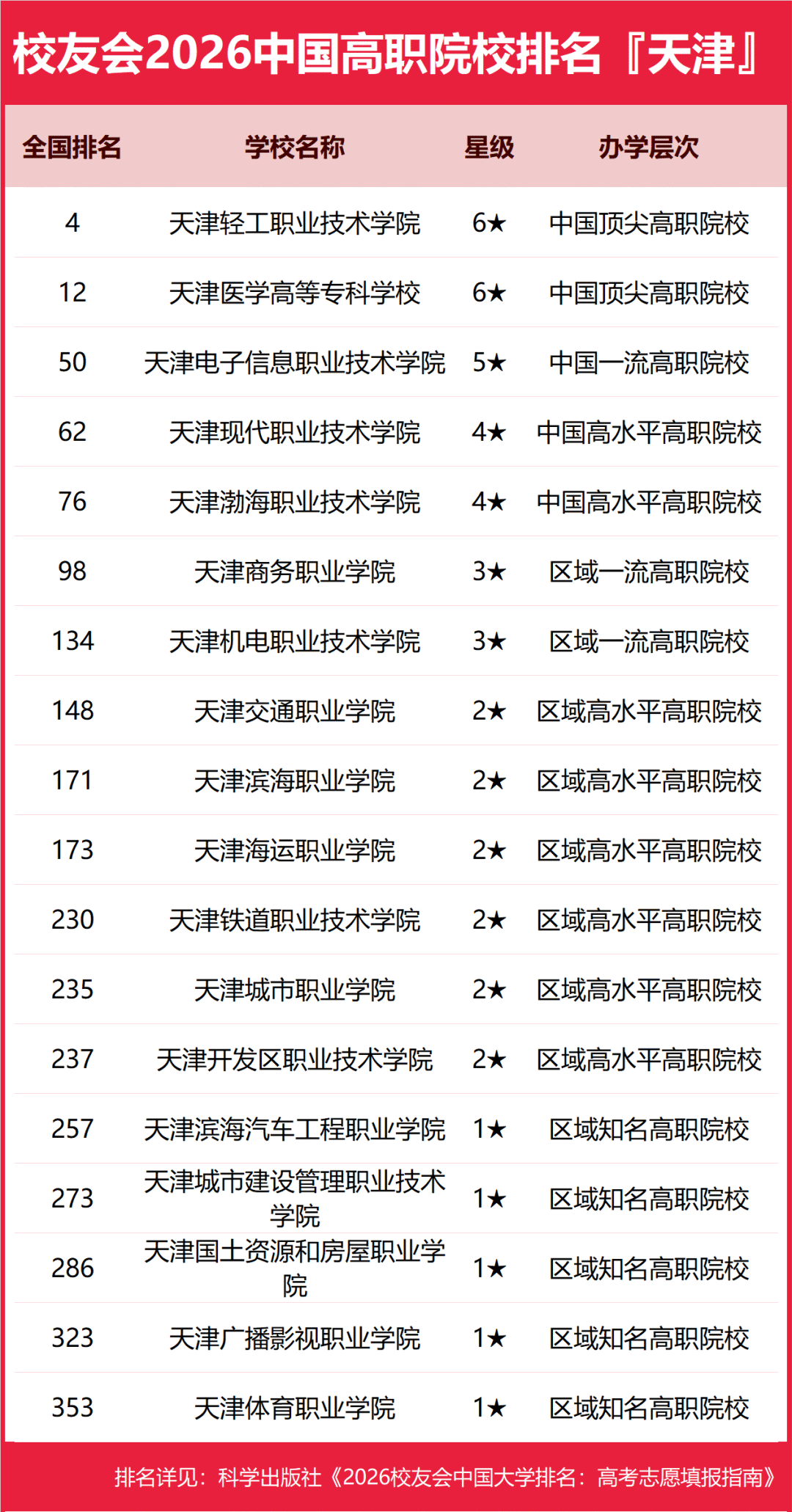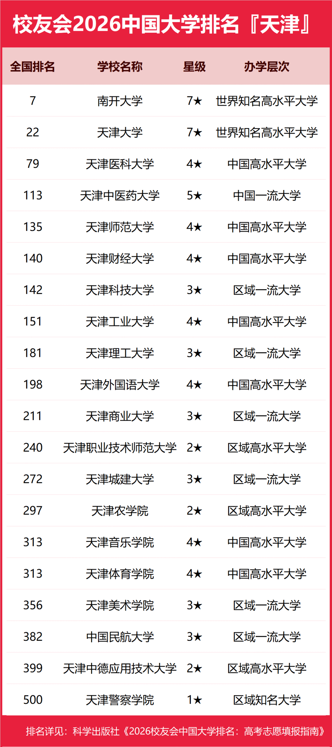 目前,校友會2026年天津市各大學最新排名已發(fā)布,天津公辦本科大學排名靠前的大學有南開大學、天津大學、天津醫(yī)科大學等;天津民辦本科大學排名靠前的天津仁愛學院、南開大學濱海學院、天津天獅學院等;天津高職??圃盒E琶壳暗挠?b>天津輕工職業(yè)技術(shù)學院、天津醫(yī)學高等??茖W校、天津電子信息職業(yè)技術(shù)學院等。