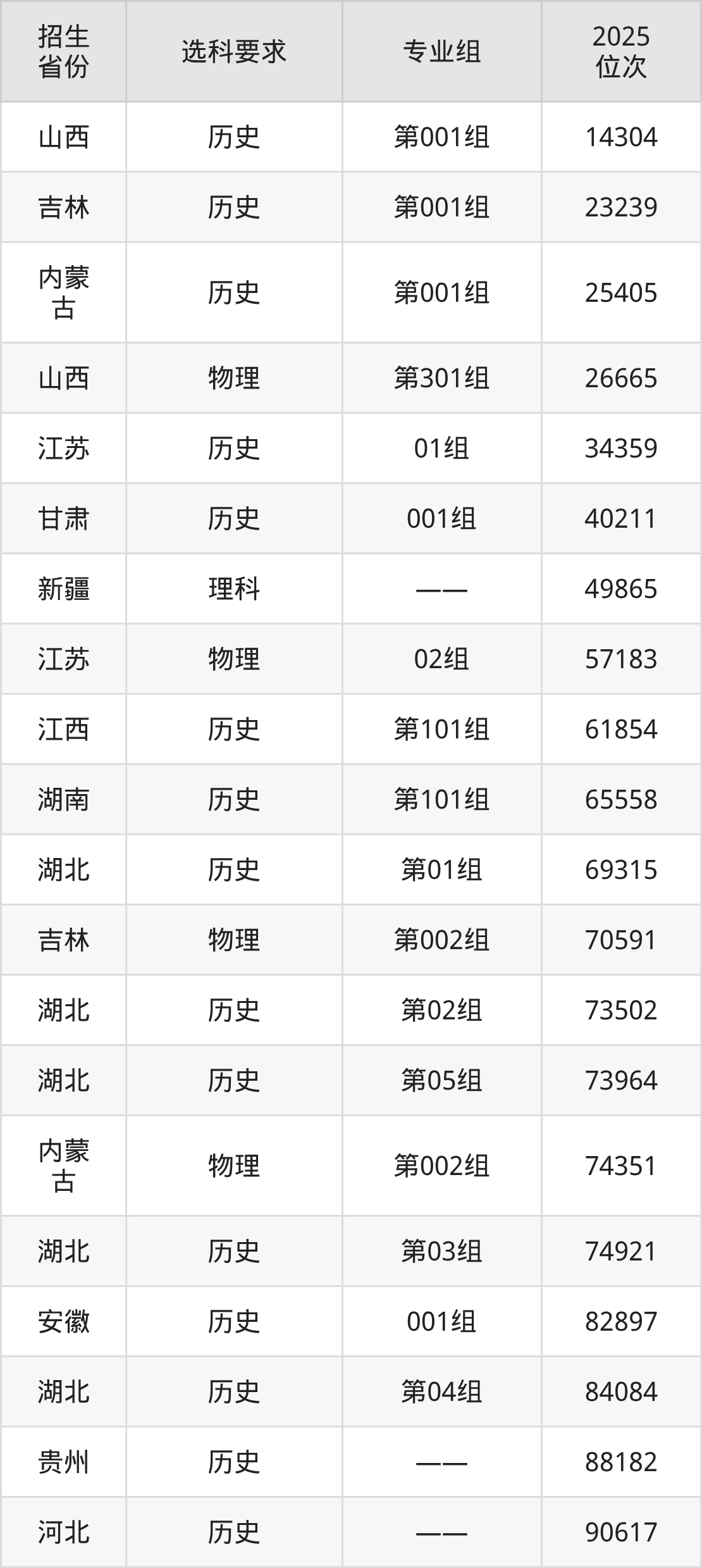 武漢工程職業(yè)技術(shù)學(xué)院2025年在全國各省的位次差異較大,最高位次是14304位(山西歷史類)、最低位次是331528位(廣東物理類)。各省具體位次請看下圖: