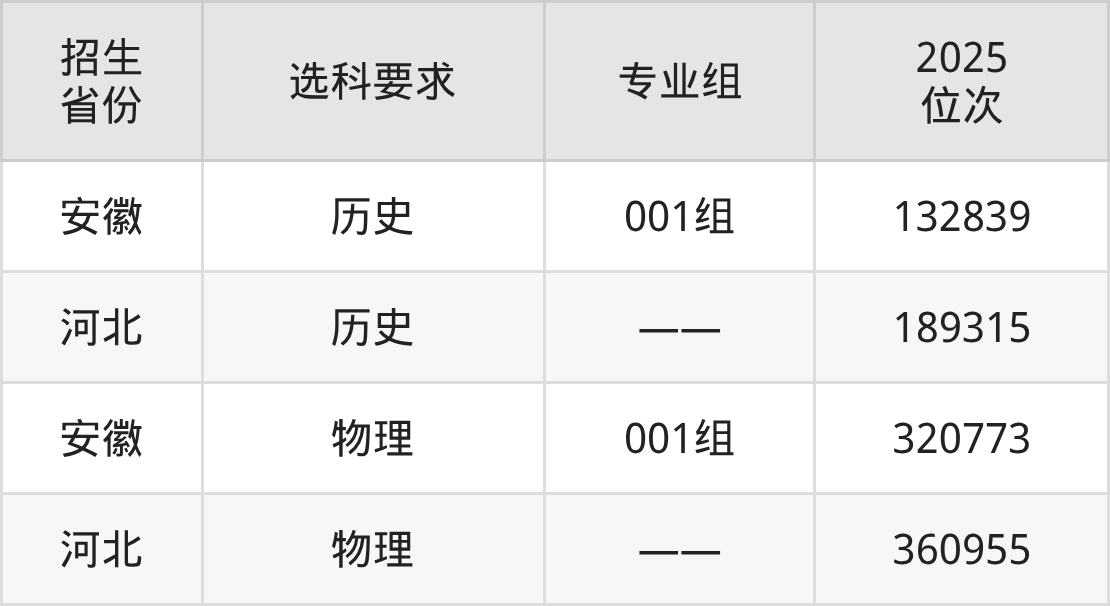 安徽綠海商務(wù)職業(yè)學(xué)院2025年在全國各省的位次差異較大,最高位次是132839位(安徽歷史類)、最低位次是360955位(河北物理類)。各省具體位次請(qǐng)看下圖: